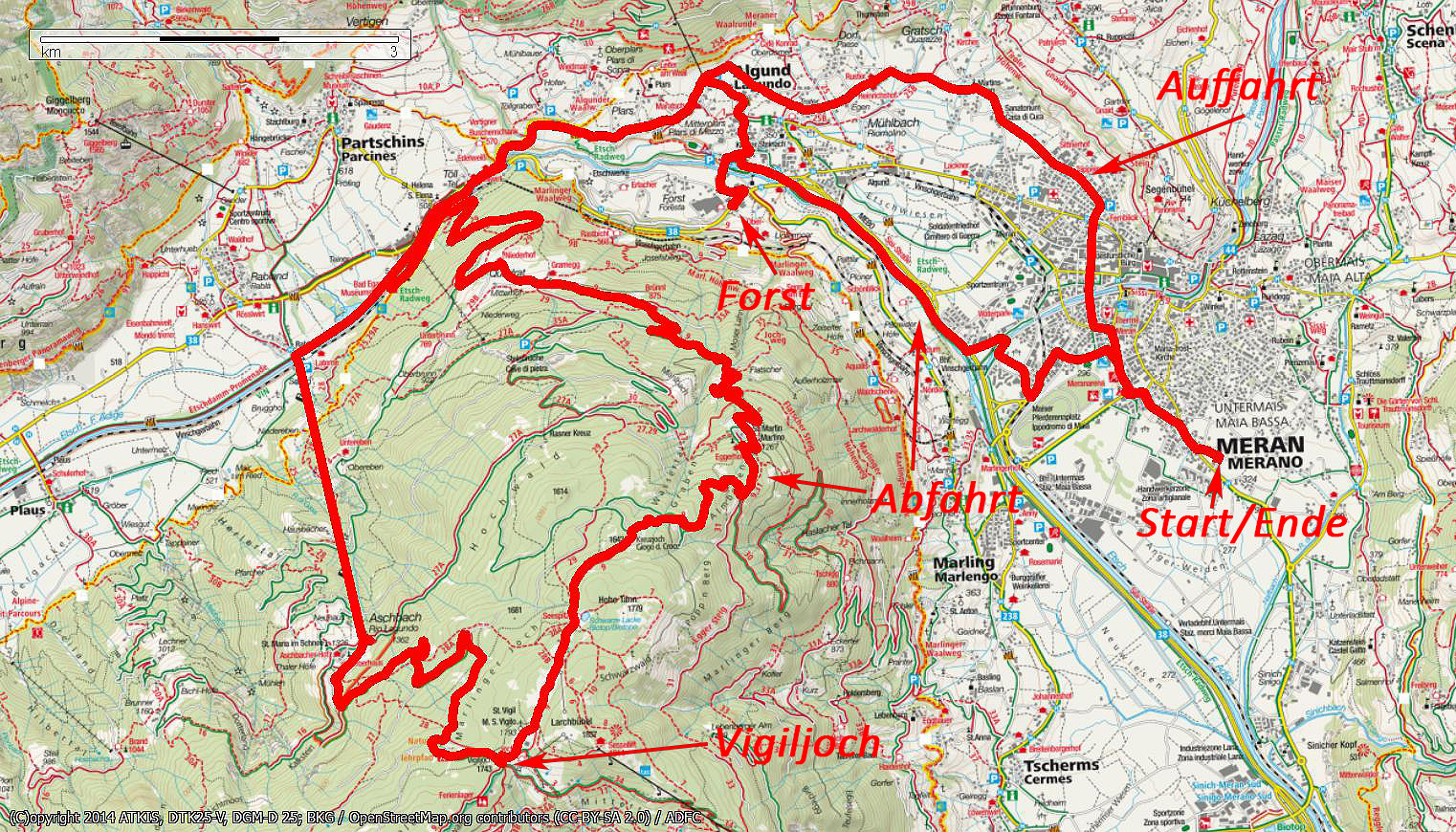 | Persönliche Bewertung | *** Von Zuhause gestartet und bis zur Talstation der Seilbahn Aschbach gefahren; mit der Seilbahn hinauf und dann bis zum Vigiljoch mit Kirchlein gestrampelt; Abfahrt über die Schwarze Lacke, Kreuzjoch, Almböden, Quadrathöfe nach Töll; weiter auf Straße nach Plars und Algund. Von dort zur Forst . Dann nach Hause . |
