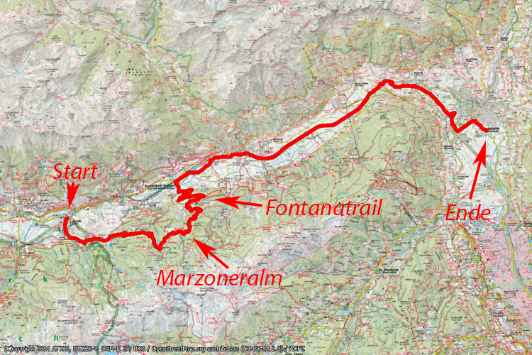 Letzten Sonntag wollten wir ja diese Tour von Meran aus machen, haben aber dann halbwegs auf dem Anstieg zur Marzoneralm schlapp gemacht. Dieses Mal waren wir schlauer und sind mit dem Zug bis nach Latsch gefahren. Auskunft am Meraner Bahnhof am Schalter sehr schwach (kein Radtransport bis Latsch, nur bis Schlanders, daher Fahrkarte bis Schlanders gekauft); bei der Abgabe des Rades an den Transporteur wurde das dann richtig gestellt: natürlich wird das Rad bis Latsch befördert und kann dort wieder übernommen werden. Da wir früh dran waren und der Zug schon am Bahnsteig stand, haben wir uns gleich einen Platz gesucht; glücklicherweise, der Zug wurde dann recht voll (nur zwei Wagone!). Um 11 h ging es dann am Latscher Bahnhof los. Durch Latsch und auf der Straße bis nach Tarsch; den Wegweisern Richtung Freiberg durch Tarsch folgend kommen wir dann zum Beginn der Forststraß. War es schon bisher steil, geht es in der gleichen Machart weiter, nur auf Schotter. Zumindest ist es im Wald etwas weniger heiß. Wir kurbeln die Forststraße hoch, so wie letzten Sonntag. Einmal steigen wir ab und schieben ein paar Hundert Meter, um Luft zu holen und den Rücken zu strecken. Auf halbweg mündet der Forstweg in die Teerstraße, die von Latschinig nach Freiberg führt; hier sind wir letzten Sonntag umgekehrt, aber damals hatten wir auch schon fast 40 km und 1000 Hm in brütender Hitze hinter uns. Heute geht's weiter; nach Freiberg geht die Teerstraße bald wieder in eine Schotterstraße über und dann läßt auch die Steigung so langsam nach. Das letzte Stück ist dann richtig angenehm. Nach 2 Stunden sind wir auf der Marzoneralm; eine Menge Leute, eine Menge E-MTB's und außer unseren 2 normalen MTB's noch zwei, drei andere normale MTB's. Jetzt gibt es erstmals ein großes alkoholfreies Hefe und dann einen Teller Semmelknödel mit Pfifferlingragu. Ausgezeichnet, nur zu empfehlen. Nach einer längeren Rast und einem Enzianschnaps zum Verdauen und als Kurvengeist geht es an die Abfahrt. Die Abfahrt folgt einem Steig; teilweise steil und auch Spitzkehren, die für uns gerade noch fahrbar sind. Ein paar Meter müssen wir absteigen; über unser Können. Später ist der Trail dann als MTB-Trail ausgeschildert (Fontanatrail). Wie fahren den Trail nicht zur Gänze, sondern nehmen im unteren Teil die Teerstraße. Trails im Downhill zu fahren ist ganz nett anstrengend und wir sind erschöpft, daher die einfache Variante. In Tschars angelangt folgen wir anfangs den kleinen Staßen orographisch rechts der Etsch, bevor wir dann ab Staben den Radweg nehmen. Es ist unglaublich heiß; manchmal durchfahren wir so heiße Luftseen, dass wir uns in eine Saune versetzt wähnen. In Plaus rasten wir nochmal und trinken noch ein alkoholfreies Hefe. Nach insgesamt 4 1/2 Stunden reiner Fahrzeit sind wir zu Hause in Meran.