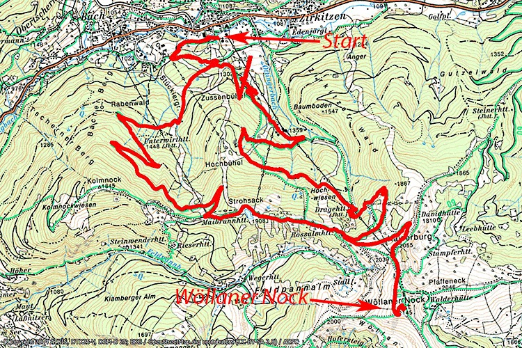 Um 10:30 h am Parkplatz der Kaiserburgbahn in Bad kleinkirchheim los. Ursprünglich war geplant, mit der Bahn hinauf zu fahren und dann den Kamm über Wöllaner Nock, Vorderen Wöllaner Nock, Dürren Baum bis zum Messnerwirt zu fahren und dann zurück. Aber Eli mag die kleinen Gondeln nicht so sehr und so entscheiden wir uns, mit eigener Kraft bis zum Wöllaner Nock hinaufzutreten. Anfangs einen Wanderweg, der direkt am Parkplatz startet (auch für Fahrräder zugelassen), teilweise eben und teilweise mit kurzen steilen Passagen, bis zur Forststraße folgend, geht es dann, anfangs steiler und dann in recht angenehmer, fahrbarer Steigung aufwärts. Es kommen uns bereits MT-Biker in der Abfahrt entgegen, e-Biker überholen uns aufwärts. Zwischendurch ein paar Mal rastend, geht es unablässig aufwärts; an der Mittelstation vorbei kommt dann irgendwann weit über uns die Bergstation in Sicht. Zwei Biker in der Abfahrt grüßen uns; einer der beiden sieht unsere Räder an und sagt anerkennend: „Ka Akku, na“. Bei der Rossalmhütte legen wir eine Rast ein und plaudern mit einem Villacher, der ebenfalls mit einem Bio-MTB unterwegs ist. Er gibt uns einen Tip für die Abfahrt und empfiehlt uns wärmstens, bis zum Gipfel des Wöllaner Nocks aufzufahren. Nach kurzer Rast wird weiter gestrampelt; bei der Bergstation holt sich Eli Wasser für den letzten Anstieg. Den Gipfel immer in Sicht quälen wir uns die letzten 100 Hm hinauf. Aber dann ist der Gipfel erreicht. Natürlich ist nichts mit Einsamkeit, zu nahe ist die Bergstation. Ganze Heerscharen bevölkern den Gipfel und genießen die Aussicht. So wie wir auch. Gipfelfoto, ein Gel und dann geht es an die Abfahrt. Bis zur Rossalmhütte folgen wir dem Auffahrtsweg, dann geht es in leichtem Auf und Ab bis zum Strohsack. Dort kurz die steile Piste hinunter zur Bergstation des Maibrunnliftes und dann über die Forststraße. Kurz vor Bad Kleinkirchheim treffen wir auf die Aufffahrtsstraße und folgen dann dem Anstiegsweg bis zum Parkplatz.
