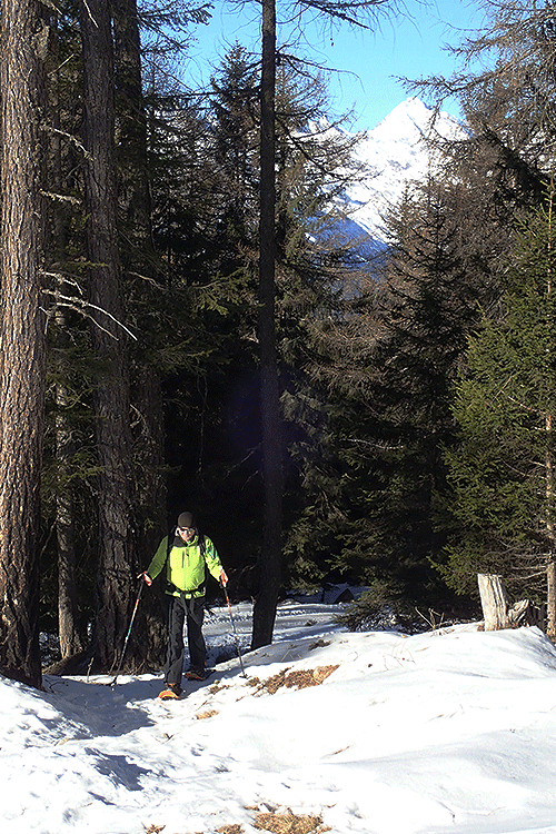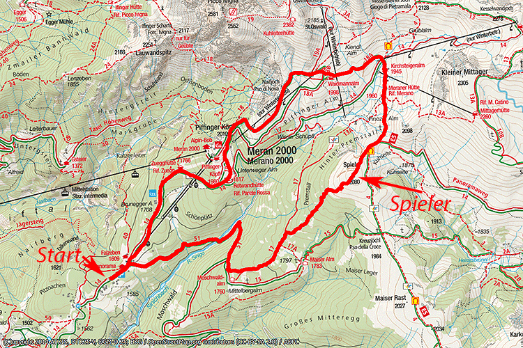 Um knapp nach zehn starten wir am erst halbvollen Parkplatz in Falzeben; Schifahrer sind anscheinend noch größere Spätaufsteher als wir. Die Tourenschi und Schneeschuhe kommen an den Rucksack, da ich daran zweifle, dass sofort genügend Schnee liegen wird. Am Hotel vorbei, das jetzt Josef Mountain Resort heisst (und anscheinend nicht mehr Falkensteiner) geht es auf der Forststrasse nach Osten. Wie erwartet liegt anfangs gar kein Schnee und dann nur wenig mit reinem Eis gemischt (war zu erwarten). Kurz vor der Brücke, bei der letzten kleinen Steigung lege ich die Schi an, Bernd wartet gleich nach der Brücke. Wir werden von einigen Leuten überholt (die meisten zu Fuß ohne Schneeschuhe, dafür einige mit Grödel; auch ein Schitourengeher ist dabei). Wir gehen unser Tempo und vor der Moschwaldalm gehen wir vom Steig ab und folgen der Schispur. Ab da sind wir alleine unterwegs. Wir kommen dann wieder auf den Winterweg, der von der Maiser Alm her kommt und zur Bergstation der Seilbahn quer durch das Schigebiet führt. Wir folgen dem Winterweg ein Stück, bevor die Schispur wieder abzweigt. Nach einem weiteren Flachstück steigt das Gelände an, was heisst, dass der Gipfel nicht mehr so weit ist. Nach insgesamt bissschen mehr als einer Stunde und dreiviertel sind wir am Gipfel. Niemand da. Während wir unseren Tee auspacken und ich die Schi für die kurze Abfahrt vorbereite, kommen einige der Wanderer, die uns überholt hatten, auch an, ebenso der Schitourengeher (sind alle dem Forstweg gefolgt und dann vom Kreuzjöchl herauf gekommen). Dieser macht von uns ein Foto, dann geht er weiter ohne abzufellen. Bernd und ich essen ein paar Kekse, trinken Tee und haben es nicht eilig. Wir vereinbaren, dass er von der Kirchsteigeralm sofort Richtung Winterwanderweg geht, während ich auffelle und über die Waidmannalm zur Bergstation des Sessellift Piffing aufsteige. Dadurch wird er nicht viel später als ich beim Auto sein. Die Abfahrt vom Gipfel ist nicht berauschen, außerhalb der schmalen Abfahrtsrampe, die angefahren und hart ist, gibt es nur Plattenpulver. Es kommen jetzt ganze Horden von der Meraner Hütte her Richtung Gipfel. Nach der Kirchsteigeralm felle ich auf und schlurfe so gemütlich Richtung Waidmannalm. Bernd sehe ich unter mir zum Winterweg gehen. An der Bergstation (war früher mal die Mittelstation des Gondelliftes, aber das ist lange her) rüste ich mich für die Abfahrt. Zuerst die lange Schrägfahrt, die meine ungeübten Oberschenkel beansprucht; wusste nicht, dass ich so schlecht in Form bin. Dann Richtung Piste oberhalb der Rotwandhütte. Wo die Piste hart ist, merke ich, dass meine Kanten nicht den Namen verdienen. Muss höllisch aufpassen, nicht auszurutschen. Weiter zur Zuegghütte und der Talstation bei Falzbeben. Nach 2 3/4 Stunden insgesamt bin ich wieder beim Auto. Eine Viertelstunde später kommt auch Bernd. Wir fahren bis zum Hotel Sonnenheim in Hafling-Oberdorf, wo wir uns unser übliches alkoholfreihes Hefe gönnen.