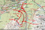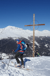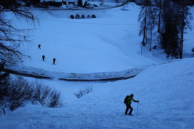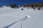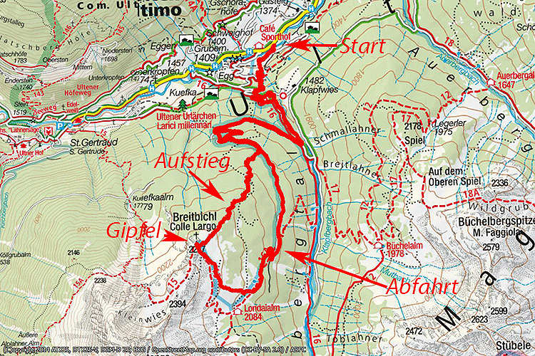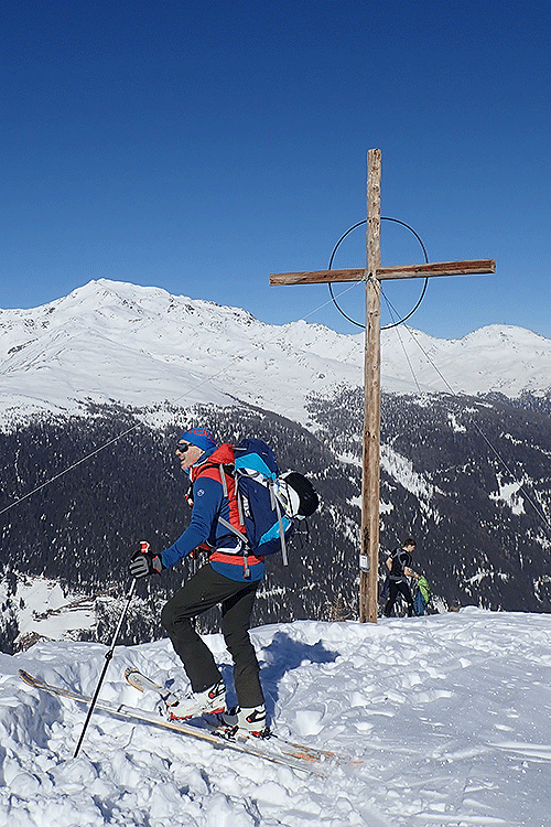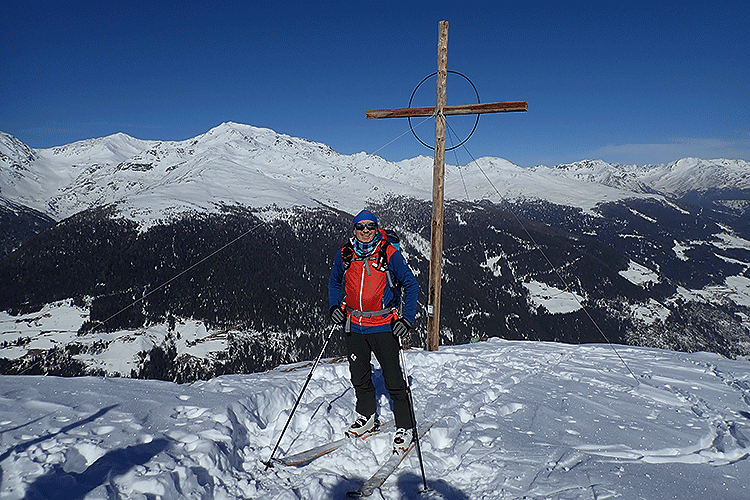 Wir starten um 8 Uhr in Meran und um 9 Uhr vor dem früheren Hotel Sporthof (jetzt ein Appartmenthauzs); ein paar Meter weiter gibt es jetzt auch einen Parkplatz (taleinwärts links abbiegen und über Brücke). Vor uns startet eine italienische Gruppe und vom genannten Parkplatz sehen wir weitere Schitourengeher beim Anlegen. Nach ein paar Meter auf der Langlaufloipe geht es links ab und den schon etwas zerfahrenen Hang hinauf. Wir queren 2 Mal die Strasse, dann erreichen wir den Forstweg. Es geht nun das Klapfbergtal hinein, bis eine Forststrasse Richtung Londaialm abzweigt. Weiter über diese Strasse; nach der ersten Kurve wird durch den Wald abgekürzt. Hier entscheidet sich Bernd zur Londaialm zu gehen und mich alleine Richtung Gipfel aufsteigen zu lassen. Nach dem Abschneider kommt wieder ein Stück auf der Forststrasse, bevor die Spur endgültig die Strasse verlässt und steil durch den Wald bergan geht. Die Forststrasse bis hierher zieht sich; früher ging man bald nach der Abzweigung Richtung Londaialm durch den Wald. Damals war dies aber eine Schitour für Einheimische und die wussten, wo es lang geht. In den letzten Jahren war der erste wohl jemand, der die Tour von einem Tourenportal heruntergeladen hat und dadurch hatscht man eben lange auf der Forststrasse entlang. Es gibt auch einige, die der Forststrasse bis kurz vor der Londaialm folgen und dann den Markierungen des Sommerweges folgen. Aber was soll das Gejammere; wir hätten ja unsere eigene Spur spuren können. Aber körperliche und geistige Faulheit siegen. :-) Meine Kondition ist nicht die beste, aber trotzdem überhole ich die italienische Gruppe vor mir und werde bald danach meinerseits von einer Gruppe überholt. Ich weiss, dass ab dem Punkt, wo sich der Wald lichtet und die Steilheit nachlässt, noch 200-300 Hm bis zum Gipfel sind und diese Meter ziehen sich. Ich spüre meine Oberschenkel und bin heilfroh als ich endlich am Gipfelkreuz angelangt bin. Es sind insgesamt 10 Tourengeher am Gipfel und einer ist so nett, ein paar Fotos von mir zu schießen. Dann wird abgefellt, die Schi auf Abfahrt gestellt und endlich gönne ich mir die Jause und den heißen Tee. Ich ratsche ein bisschen mit den anderen; auch Bernd meldet sich, dass er kurz vor der Londaialm Schluss gemacht hat und ebenfalls isst und rastet. Nach der ausgiebigen Rast mache ich mich für die Abfahrt fertig; erstmals kommt der neuerworbene Schihelm (natürlich im Ausverkauf zum halben Preis erworben; der volle Preis ist ja Irrsinn). Ich habe mir Schihelm und Avibag zugelegt, da ich nicht mehr die Erfahrung und das Können von früher habe (kein Wunder bei höchstens 2 Schitouren pro Saison :-(, vielleicht werden's heuer mehr; bin schon bei 2). Bernd hat in der Zwischenzeit ge-sms-t, dass er schon im Abstieg ist. In Schrägfahrt geht es Richtung Londaialm, bevor ich in Sichtweite der Alm die Hänge abfahre. Geht ganz gut, der Schnee ist ihn Ordnung, nur meine Oberschenkel protestieren. Auf der Forststrasse angekommen bin ich versucht, die Waldschneise bis zum Forstweg im Tal abzufahren, aber meine schmerzenden Beinmuskulatur rät mir davon ab. So folge ich der Forststrasse; bald treffe ich Bernd und wir tauschen uns kurz aus. Dann geht's weiter auf der Strasse; immer wieder einen Schwenker in den bergseitigen Pulver um Geschwindigkeit rauszunehmen. Pflugfahren ist zu anstrengend. Kurz bevor die Forststrasse in die Forststrasse aus dem Klapfbergtal trifft überhole die vor mir gestartete Gruppe, bald danach überholt mich die andere Gruppe aus dem Klapfbergtal kommend. Sind offensichtlich nach der Alm durch die Schneise abgefahren. Ich kämpfe mich noch die letzten freien Hänge hinunter; nicht wegen des Schnees, der ist noch gut, wenn auch zerfahren und etwas schwerer, sondern wegen meine fehlenden Kraft. Die letzten Meter auf der Loipe und ich bin beim Auto. Nachdem ich alles verpackt habe, brauche ich nicht lang zu warten, dann ist auch Bernd da.