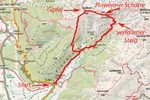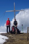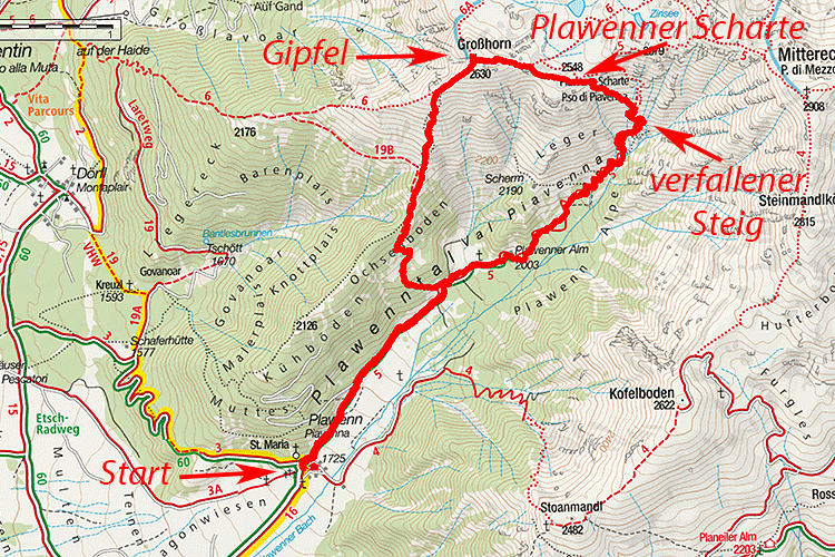 Um kurz nach acht in Meran los und um halb zehn vom Parkplatz vor Plawenn gestartet. Durch das Dorf und weiter auf dem Wirtschaftsweg ins Plawenner Tal. Kurz vor der Plawenner Alm geht der Steig links ab und ab da geht es zur Sache. Die meiste Zeit eher steil gewinnen wir schnell Höhe. Auf ca. 2250 m leitet der Steig über den Zaun und quert die Barenplais laut Karte mit leichtem Höhenverlust bis er am nächsten Rücken auf den 6er-Steig trifft. Laut Karte geht ein umarkierter Steig direkt von unserem Standpunkt zum Kamm kurz vor dem Gipfel und nachdem auch ein Pfeil auf einem Stein nach oben zeigt, folgen wir dieser Aufforderung. Weglos, da sich das unmarkierte Steiglein nicht finden lässt, kämpfen wir uns nach oben, den Gipfel immer im Blick. Stimmt zwar nicht ganz, da der Gipfel ein paar Meter hinter dem Scheingipfel versteckt ist, aber das stellen wir erst kurz unter dem Gipfel fest. Ein Weidezaun zieht sich links von uns immer am Rücken Richtung Gipfel. Wir sehen weiter oben kurz vor dem Scheingipfel einen anderen Wanderer. Ca. 100 Hm unter dem Gipfel steigen wir über den Weidezaun und finden uns auf dem nun wieder markierten Steig 6A wieder. Eine viertel Stunde später sind wir am Gipfel. Der andere Wanderer rastet schon dort und erzählt uns, dass er heute nicht ganz in Form ist. Seine zwei Kollegen sind schon fast auf dem Mittereck. Wir machen es uns auch gemütlich und marenden und schießen einige Fotos. Die Berge ringsum sind noch ziemlich mit Schnee bedeckt und die beiden Kollegen müssen sich drüben am Mittereck ganz nett durch den Schnee kämpfen, wie wir mit den Fernglas sehen können. Der Habicher ist fast gleich hoch und wäre ein weitaus leichteres Ziel, da ein Rücken schneefrei bis fast zum Gipfel führt. Mit dem Fernglas sehen wir auch zwei Gemsen am Kamm des Habichers. Wir sind recht zufrieden mit uns, aber verzichten auf den Habicher. Wäre für die erste Bergtour nach einigen Monaten dann doch vielleicht etwas zuviel. Nach der Rast packen wir unsere Siebensachen zusammen und gehen leicht abwärts zur Plawenner Scharte, zeitweise auf gut tragendem Schnee. Laut Karte müssten wir nun ein Stück Richtung Nordost und ca. 50 Hm aufsteigen, um den Steig 5 zu finden. Ich weiss aber von meiner ersten Besteigung 1995, dass der Steig kaum begangen ist und auch nicht so leicht zu finden und so beschließen wir direkt von der Scharte weglos abzusteigen und hoffen dann den Steig zu queren. Gesagt, getan. Wir steigen ab und halten uns dabei immer leicht nach Osten bis wir effektiv den Steig finden. Er ist sichtlich kaum begangen und die paar Markierungen, die wir ab und zu (meist bei den Biegungen) finden, sind stark verbleicht. Wir müssen wie die Haftlbeisser aufpassen, dass wir den Steig nicht verlieren. Als es dann doch geschieht, finden wir ihn bald wieder. An der Südseite eines übermannsgroßen Steines finden wir dann die am besten erhaltenen Markierung mit der Zahl "5" in einem Kreis. Der Steig leitet uns in großem Zickzack bis in den Talboden, wo wir den Forstweg finden, der offensichtlich von der Wildbachverbauung bis hierher geführt wurde, um eine Rückhaltesperre und eine Wasserfassung zu bauen. Auf einem großen Stein am Wegesrand ist ein nach oben gerichteter Pfeil zu sehen; wir können nicht entscheiden, ob das Steiglein hier seinen Anfang findet, da hier alles unter Schnee liegt. Wir schneiden die Kurven des Weges meist ab, da es auf dem Gras angenehmer zu gehen ist als auf der Straße. Wir kommen an der Alm mit ihrem großen Stallgebäude vorbei und wandern entlang der meliorierten Wiesen talaus bis Plawenn.