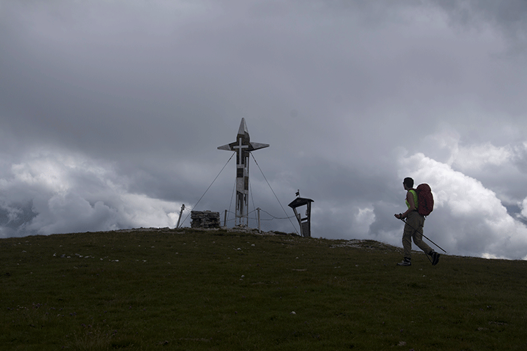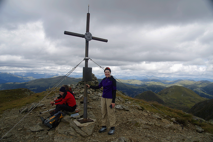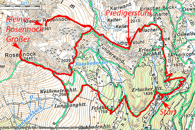 Um 09:40 strartet unsere Wanderung auf einer Forststrasse Richtung Feldhütte. Um einen Rücken herum und über einen Bach erreichen wir eine Abzweigung Richtung Predigerstuhl, die wir aber ignorieren. Eine Kurve weiter ist die Feldhütte erreicht; hier beginnt der Steig. Es geht nun ziemlich direkt bergan, oder aber wirklich steil zu werden. Es sind ziemlich einige Leute unterwegs; wir überholen ein paar, einige überholen uns. Glücklicherweise ist die Sonne meist hinter einigen Wolken versteckt, wodurch es nicht so heiß ist. Nach knapp 2 Stunden haben wir die 800 Hm bis zum Gipfel hinter uns und stehem mit einigen anderen auf dem Großen Rosennock. Rundum erheben sich andere Nockies, die nächsten davon der Kleine Rosennock und der Predigerstuhl, unseren nächsten Zielen. Ich gehe einige Schritte hinunter Richtung Scharte zwischen dem Großen und Kleinen Rosennock. Es ist, soweit ich sehen kann, ein gut begehbarer Steig, aber im Bereich der Scharte ziemlich ausgesetzt. Eli kommt nach und sieht sich die Sache ebenfalls an, aber da sie nicht ganz schwindelfrei ist, beschließen wir den Anstiegsweg abzusteigen und den Kleinen Rosennock über den anderen Rücken zu besteigen. Nachdem wir zwei Energieriegel gegessen haben, geht es bergab bis zur Abzweigung zum Nassbodensee. Um den See herum und durch die Zunderwand teilweise leicht ausgesetzt zum Kalten Keller. Dort machen wir uns weglos auf zum Kleinen Rosennock, dessen Kreuz die ganze Zeit klar zu sehen ist. Nach 1 3/4 Stunde ab Großem Rosennock stehen wir alleine am Gipfel des Kleinen Rosennock. Hier nehmen wir uns etwas mehr Zeit und genießen unsere mitgebrachten Brote und die Aussicht über die Nockberge. Nach einer ausgiebigen Pause packen wir zusammen und schlendern den Rücken hinunter zum Kalten Keller. Vorn dort aus folgen wir der Markierung auf den Predigerstuhl. Die Wolken ziehBild_4en zu und kurz vor dem Gipfelkreuz beginnt es ganz fein zu nieseln. So halten wir uns nicht auf, machen nur schnell ein Photo und gehen weiter. Bis hierher haben wir insgesamt 4 1/2 Stunden gebraucht. Als wir vom Gipfel weg sind, hört es schon wieder auf zu nieseln und die Sonne kommt heraus. Gleich wird es warm.Anfangs am Rücken, dann im Zigzag durch den Abruch auf Steig 13 Richtung Erlacher-Bock-Scharte. Dahinter grüßt der Pfannnock. Eine Steigspur geht geradeaus Richtung Scharte, aber wir nehmen den markierten Steig Richtung Talboden, um dann am Erlacher-Bock, einer Erhebung, vorbei die gleichnamige Hütte zu erreichen. Wir kehren nicht ein, da Eli beim Herfahren ein Schild bei der Petodnighütte gesehen hat, das Kärntner Reindling mit Kirchtagssuppe versprochen hat, und sie wieder einmal dieses Kärntner Gericht essen will. Also weiter und nach insgesamt 5 Stunden und 40 Minuten reiner Gehzeit sind wir wieder beim Auto, auch wenn sich der Weg auf dem Wirtschaftsweg von der Erlacher-Bock-Hütte bis zur Erlacher Hütte sich noch einmal richtig gezogen hat. Ein wirklich gutes Gefühl die Bergschuhe aus und die Sandalen anziehen zu können. Langsam rollen wir talaus bis zur Petodnighütte. Als wir nach der Kirchtagssuppe fragen, erfahren wir zu Elis Leidwesen, dass diese schon aus ist; ich bin nicht so traurig, da ich kein so großer Fan von saurer Suppe bin. Stattdessen gibt es Kaiserschmarren und eine alkoholfreies Hefe. Auch gut.