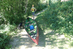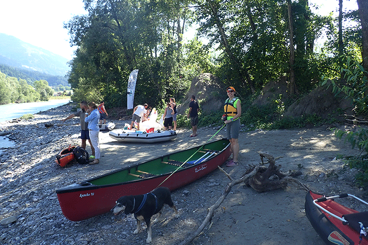 Um Punkt 11 Uhr starten wir dann. Der Wasserstand ist ideal, nicht zu hoch, aber auch nicht zu niedrig. Die Ufer sind praktisch durchgehend bewachsen und dadurch kommt ein gewisses Wildnissfeeling auf. Ist die Bewachsung einmal etwas spärlicher, blicken wir auf Wiesen und grasende Kühe. An einer Stelle wagen sich zwei Kühe bis ans Wasser und stehen sogar im Wasser. Wahrscheinlichum sich etwas abzukühlen. Wir lassen uns nur selten treiben und paddeln statt dessen kontinuierlich. Dadurch kommen wir gut voran und überholen einige andere Boote. Viel Verkehr herrscht nicht, aber einige sind mit Gummibooten unterwegs und haben Bierkisten dabei; da geht es dann nicht so schnell voran. Ist dann ja auch nicht die Absicht. Auch auf einer großen Kiesbank rasten andere Kanuten und in der Nähe von Dellach liegen einige Kanus am Ufer. Die Insassen spielen am Aussichtsturm mit Plattform.