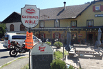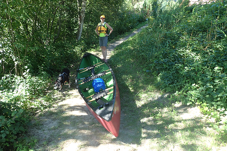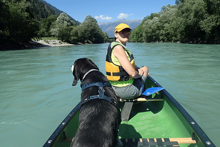 Nach bisschen über anderthalb Stunden sind wir an der Aussetzstelle von Greifenburg bei der Brücke über der Drau. Wir ziehen das Kanu etwas höher ans Ufer, drehen es um und platzieren Paddel und Schwimmjacken unter dem Kanu. Willi, der das Kanufahren zwar sehr liebt, schätzt die Unterbrechung aber doch, da er sich dann die Beine vertreten kann (wie wir) und auch seine Markierungen hinterlassen kann. Wir überqueren die Drau auf der Brücke (die Aussetzstelle ist orographisch links) und gehen Richtung Bruggen; nach ein paar hundert Meter erreichen wir den Gasthof Wulz. Laut Eigenwerbung schenkt er bzw. verkauft im eigenen Biershop mehr als 1000 Sorten Bier aus aller Welt. Haben wir aber nicht verifiziert; sondern sind bei alkoholfreiem Hefe geblieben. Wir bleiben im Freien und Eli bestellt eine Salatplatte, während ich einen Kaiserschmarrn wähle. Der Schmarrn ist nicht schlecht, wenn er auch mehr einem zerstochenen Pancake gleicht. Aber ich bin etwas wählerisch was Kaiserschmarrn angeht; für mich muss das Eiweiß aufgeschlagen und untergehoben werden, damit er fluffig wird und außerdem müssen Rosinen drin sein (besser noch wenn sie vorher in Rum aufgeweicht wurden) und fein geschnittene Apfelscheiben. Schlußendlich kommt noch Kristallzucker auf den zerissenen Schmarrn sein. Nach dem Mittagessen spazieren wir zum Kanu zurück (das wir unversehrt und vollständig wiederfinden) und nehmen unsere Fahrt wieder auf. Jetzt nehmen wir es nicht mehr so sportlich und lassen uns zwischendurch auch treiben. Das Uferbild ändert sich nicht und wir genießen die Paddeltour. Auch Willi geht seiner Lieblingsbeschäftigung nach: er steht an einer Kanukante und hat die Nase meist fast auf Wasserniveau, nur um plötzlich zur anderen Kanuseite zu gehen und von dort aus Kühe am Ufer anzubellen oder Fische im Wasser zu betrachten. Er bringt jedesmal das Kanu zum Schaukeln und ich muss hin und her rutschen, um seine Bewegungen auszgleichen. Nur zwischendurch legt er sich ins Boot, aber schon als wir uns der Aussetzstelle in Sachsenburg nähern, passen wir genau auf, um diese nicht zu verpassen, was uns auch gelingt. Wir legen an, ziehen das Kanu höher und legen Paddel und Schimmwesten ins Boot wie uns vom Verleiher angesagt worden war. Noch ein paar Meter aufwärts, dann sehen wir schon den Campingplatz und sind bald danach beim Auto.