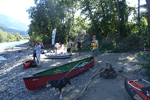 Wir sind etwas vor 10 Uhr da und müssen sogar kurz warten, da auf der Zufahrtsstrasse gerade der Einzug der Flößer für die Oberdrautaler Flößertage stattfindet. Es sind Teilnehmer aus ganz Europa in historischen Gewändern dabei. Wir werden in einem 9-Sitzer-Bus mit Anhänger, auf dem die Kanus untergebracht sind, nach Oberdrauburg gefahren. Dort am Parkplatz des Bahnhofes sind es nur ein paar Meter bis zur Einsetzstelle, die mit einem Wimpel des Veranstalters gekennzeichnet ist. Es sind auch einige Paddler vor Ort, die mit ihren eigenen Kanus starten wollen.