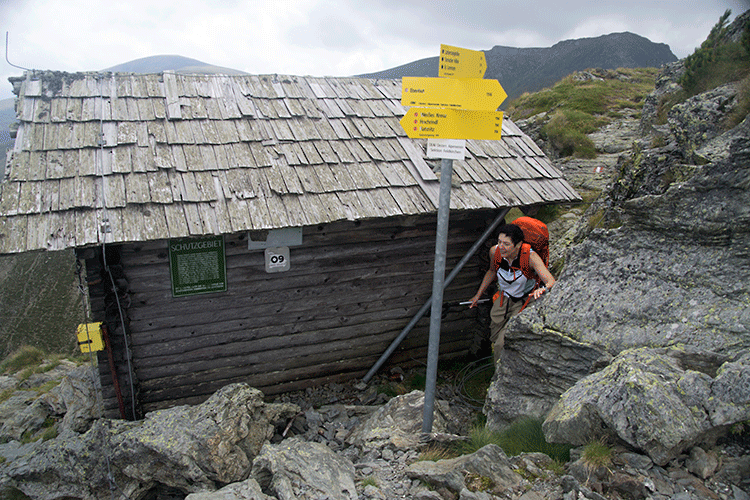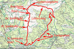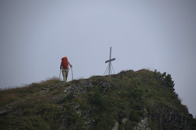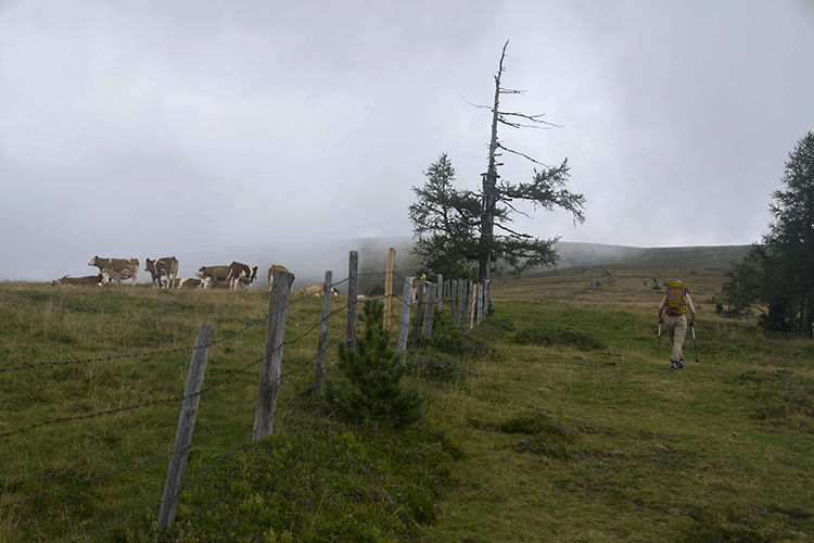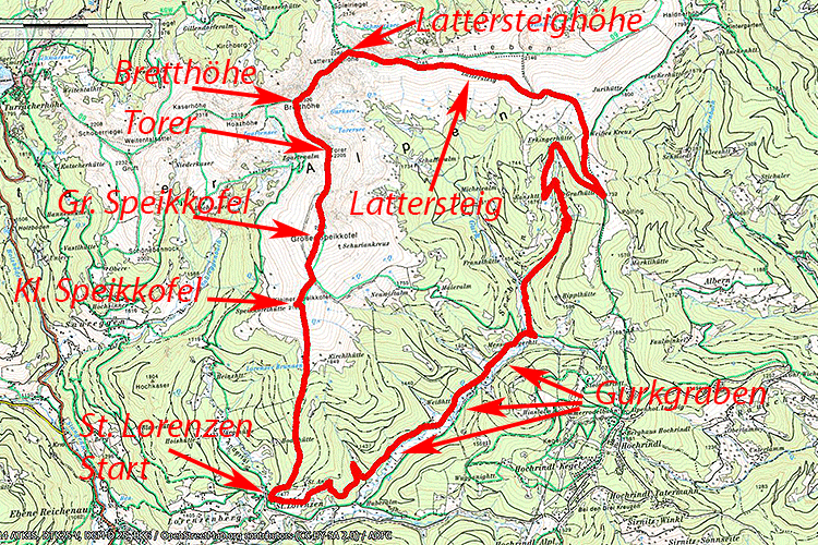 Um 10:30 h am kleinen Parkplatz vor der Kirche in St. Lorenzen los. Das Wetter ist nicht so besonders, sollte aber ab Mittag besser werden. Zuerst geht es durch den Wald aufwärts; ausnahmsweise nicht so steil wie sonst üblich in den Nockies, wenn auch immer noch ziemlich geradlinig. Auf ca. 1800 m verlassen wir den Wald; entlang eines Zaunes geht es weiter aufwärts. Wir auf der einen Seite des Zaunes und die Rindviecher auf der anderen. Ein kleines Schild weist uns auf eine kleine Quelle hin, den Lorenzer Brunnen. Die Nebel hängen noch tief, beginnen sich aber so langsam aufzulösen. Ein Stück abseits des markierten Steiges wird der Kleine Speikkofel durch einen Steinhaufen angezeigt. Da können wir nicht einfach vorbeigehen; flugs den Steig verlassen und nach 20 m sind wir am Gipfel des Kleinen Speikkofel angelangt. Bergheil. Weiter geht's. Der Große Speikkofel liegt genau im Blickfeld, der Gipfel noch in Nebel gehüllt. Andere Wanderer kommen uns im Abstieg entgegen. Bald sind wir am Gipfel, der durch einen Steinhaufen und ein verbeultes gelbes Schild auf kurzer Stand gekennzeichnet ist. Wir halten uns nicht lange auf und gehen weiter. Der Steig verliert ein bißchen an Höhe; rechts von uns fällt das Gelände steil ab. Nach dem Abbruch überschreiten wir den Torer, unseren dritten Gipfel des Tages, ohne dass wir es richtig mitbekommen. Entlang eines Zaunes, der die Weiden links von uns von einem neuerlichen Abbruch Richtung Gurksee und Torersee trennt, steigen wir weiter Richtung Bretthöhe. Die Sonne findet immer wieder Löcher in der Wolkendecke; als wir am Gipfel sind, ist sie wieder einmal verhüllt. Wir kennen den Gipfel von einer früheren Rundtour; damals sind wir von der Turracher Höhe gestartet und haben insgesamt 5 Gipfel überschritten. Darunter waren die Bretthöhe und die Lattersteighöhe. Wir diskutieren einen Moment, wie es weitergehen soll. Ursprünglich war geplant Richtung Hoazhöhe bis zum Zgartensattel zu gehen und dann über den Steig 154 zurück nach St. Lorenzen. Ich habe jedoch in der Karte der Kompassapp die Möglichkeit gefunden, in der anderen Richtung über den Lattersteig und dann entlang der jungen Gurk nach St. Lorenzen zu wandern. Wir entschließen uns für diese Variante. War dann vielleicht nicht die beste Idee, auf so einer Karte auf dem Handy lassen sich Entfernungen nicht so genau abschätzen, vor allem dann nicht, wenn man nur so schnell draufschaut. Darüberhinaus ist bei uns auch durch die Information einer Haltestelle eines Wanderbusses beim Weißen Kreuz die Illusion aufgekommen, im Notfall die Tour mit dem Wanderbus abzukürzen. Den Weiterweg von der Bretthöhe zur Lattersteighöhe ist uns, wie gesagt, bereits bekannt. Teilweise etwas ausgesetzt geht es in Auf und Ab den Kamm/Grat entlang bis zur Lattersteighöhe. Dort biegen wir auf den Lattersteig ab. Dieser einstige Schmuggelpfad ist anfangs steil und ausgestzt; erst ab einer kleinen Schutzhütte wird aus dem Steig ein breiter Weg, der mit nur wenig Höhenverlust das Gelände ausgeht. Bei der kleinen Schutzhütte soll sich auch ein Geocache befinden; wir haben nicht danach gesucht. Irgendwann erreichen wir das sog. Weiße Kreuz mit der theoretischen Bushaltestelle; davon ist aber nicht zu finden. Keine Information, nichts; also per pedes weiter. Auf dem Wirtschaftsweg gehen wir ein Stück auf dem Trans-Nock-Wanderweg, dann zur Erkringerhütte und weiter zur Kanzhütte, wobei wir uns auf der kleinen Karte im Handy orientieren und immer die Variante wählen, die bergab führt. Kurz vor der Kanzhütte gibt es laut Karte einen alten Steig, der bergab führt. Wir übersteigen einen Zaun und folgen nur ganz schwach sichtbare Steigspuren durche eine ziemlich sumpfige Wiese und erreichen den Forstweg, der bergauf Richtung Grafhütte führt. Wir gehen natürlich nicht bergauf, sondern folgen der Forststraße in die andere Richtung bergab; wir haben schon aus der Karte gesehen, dass der Forstweg bald enden würde, aber ca. 30 Hm weiter bergab gibt es einen anderen Weg, der in die gewünschte Richtung führt. Ist nicht das erste Mal, dass wir so was machen, und das Ergebnis ist immer dasselbe: wegloser Kampf durch das Unterholz mit gutem Ausgang. Auch dieses Mal geht es so; an Büschen und Bäumen festhaltend erreichen wir den Bach und dann den gesuchten Weg. Anfangs noch schmal wird der Steig bald zu einem Weg und mündet dann in eine Forststrasse. Auf ca. 1400 m erreichen wir den Gurkgraben. Nun geht es praktisch eben entlang der jungen Gurk Richtung Südwest; anfangs auf einem markierten Steig parallel zu einer unbefestigten Strasse, dann auf der genannten Strasse selbst, das der markierte Steig verschwindet. Die Strasse verläuft in leichtem Auf und Ab; nach der Überquerung eines Seitenbaches nehmen wir die Abzweigung, die bergauf führt. Nach etwas mehr als 100 Hm bergauf erreichen wir eine große Lichtung mit einem Almgebäude. Bis zum Gebäude geht es noch ganz gut, dann müssen wir weglos zuerst durch eine nasse Wiese und dann durch den Wald, zum Glück ohne weiteres Bergauf. Und dies obwohl eigentlich ein Weg da sein sollte (laut Karte). Als wir den Wald verlassen finden wir dann endlich einen Steig, der zu einem Bauernhof führt; am Bauernhof vorbei und dann noch ein paar hundert Meter auf der Zufahrtsstrasse und wir sind wieder beim Auto. Wir sind beide heilfroh, dass die Tour zu Ende ist. Über 26 km mit mehr als 1200 Hm sind nicht von schlechten Eltern. Auf den letzten Kilometern hat mich meine Frau innerlich verflucht; zu recht. Eine Sache ist von Anfang sich auf so eine Tour einzustellen, eine andere ist, wenn eine Tour immer länger wird, auch wenn sie schon längst zu Ende sein sollte. Alles in allem für unsere Verhältnisse einen sehr lange Tour. Das Wetter wurde im Laufe des Tages immer besser und war zum Schluss eher warm. Zur Nachahmung nur empfohlen, wenn man bereits und fähig ist, sich weglos zu bewegen, denn ansonsten ist die Tour noch länger. :-).