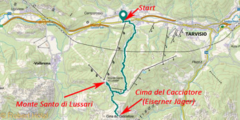 Wir fahren also in aller Früh (für unsere Verhältnisse) nach Tarvis (kennen wir schon von unserer Radreise nach Triest und weiter) und ein paar Kilometer weiter durch das Kanaltal bis zur Talstation der Seilbahn. Der Berg dient übrigens im Winter als Schigebiet. Wir parken auf dem großen Parkplatz und starten um neun Uhr. Ein Stück der Straße entlang zurück wäre die richtige Lösung, aber wir orientieren uns an der digitalen Kompass-Karte auf dem Handy und suchen uns einen anderen Weg, einen Steig der mitten durch eine Wiese führt, aber zum Glück Gehspuren aufweist. Wir würden ungern durch eine ungemähte Wiese mitten im Sommer gehen; der Bauer wäre dann zu Recht verärgert. Wir erreichen dann den richtigen Weg, der anfangs geteert ist (da Hauszufahrt). Wo die geteerte Straße in den ungeteerten Forstweg übergeht, gibt es auch einen kleinen Parkplatz für Gehfaule und außerdem einige Infotafeln. Ab hier geht es zur Sache. Der Weg steigt steil an, die Luft ist noch vom Regen der vergangenen Nacht mit Feuchtigkeit gesättigt und es wird warm. Dementsprechend fließt der Schweiß. Da es sich um einen Pilgerweg bzw. einen Kreuzweg handelt, gibt es in Abständen Betstationen. Anfangs bleiben wir noch stehen, um diese genauer anzusehen. Später gehen wir einfach daran vorbei. Es gibt eine Menge Wanderer, die uns überholen, da anscheinend nur die Fittesten zu Fuß gehen; alle anderen fahren mit der Seilbahn. Nach 1 3/4 Stunden verlassen wir den Wald uns sehen vor uns die Luscharialm. Der Weg führt daran vorbei und nach einer weiteren steilen Steigung erreichen wir eine Viertelstunde später die Abzweigung zum Eisernen Jäger (Cima del Cacciatore). Einige Wanderer, auch Familien mit Kindern, kommen von der Seilbahn her und wollen offensichtlich auf den Berg. Wir nehmen auch die Abzweigung, die sich anfangs in leichtem Auf und Ab durch Wald, bevor wir diesen verlassen und eine lange Querung durch einen Hang antreten, der so auch in den Dolomiten liegen könnte. An einer Abzweigung ohne Angeben konsultiere ich die Kompasskarte und wir nehmen den linken Abzweig. Es braucht einige Zeit bis wir darauf kommen, dass uns die Karte in die Irre geführt hat. Es mag ja sein, dass ich die Karte falsch gelesen habe, aber ich glaube eher die Karte ist falsch. (Wie man aus der Karte mit dem Track erkennen kann, waren wir laut dieser (Kompass)karte am Gipfel des Eisernen Jägers, obwohl wir in der Realität weit davon entfernt waren. Der Gipfel war an der anderen Seite des Tales, das auf der Karte nicht zu erkennen ist. Also vielleicht doch Karte falsch.) Wir kehren um, aber an der richtigen Abzweigung haben wir dann keine Lust mehr auf den Gipfel zu gehen, sondern beschließen, dies auf ein anderes Mal zu verschieben. Wir gehen zurück und nehmen dann den Weg auf den Monte Lussari. Es handelt sich dabei um einen Hügel, an dessen Fuss die Wallfahrtskirche liegt. Gipfelfoto und dann steigen wir ab zur Kirche und besichtigen diese. Gleich daneben gibt es die üblichen Shops für Devotionalien und mehrere Gaststätten. Wir genehmigen uns ein alkoholfreies Bier (Hefe haben sie nicht) und einen Kaffe. Da es ziemlich lange dauert, bis wir den Kaffe erhalten, verzichten wir darauf, etwas zu essen zu bestellen und brechen bald wieder auf. Es geht den ganzen steilen Weg zurück bis Camporosso. Diesmal gehen wir bis zur Straße und an dieser entlang bis zum Parkplatz. Wir waren fast 6 Stunden unterwegs. Auf der Heimfahrt nehmen wir diesmal die Autobahn; an der Grenze gibt es keine Probleme. Niemand hält uns auf; die Radiomeldungen waren wohl nicht so ernst zu nehmen.