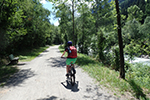 Wie erwartet sind die Temperaturen erträglich. In leichter Steigung geht es auf feinem Schotterweg und zwischendurch auf Asphalt talein. Wir queren die Passer mehrmals und kommen auch am Quellenhof bzw. den zugehörigen Golfplatz, Reitplatz, Driving Range und Tennisplätzen. Vom Quellenhof zu sprechen ist ein Euphemismus; es handelt sich um ein riesiges Hoteldorf. Bald nach dem Quellenhof müssen wir eine Entscheidung treffen. Um zum Naserhof zu kommen, müssen wir nun den Radweg verlassen und ein Stück auf der Landesstraße bis zur Abzweigung ins Kalmtal fahren. Von hier aus sind es noch knapp 900 Hm. Die Entscheidung fällt recht einfach; wir sind heute einfach nicht gut drauf und beschließen bis zum Brückenwirt und eventuell weiter bis nach Breiteben zu fahren. Bis zu letzterem sind es ca. 450 Hm. Der Radweg führt nun orographisch links der Passer an St. Martin vorbei. Kurz vor St. Leonhard unterqueren wir die Brücke der Landesstraße und sehen bald rechts von uns den Sandwirt, Geburtsort von Andreas Hofer. Weiter praktisch unter der Landesstraße, zuletzt ansteigend erreichen wir das Rondell nach St. Leonhard und neben dort die Brücke über die Passer. Vor uns liegt der Brückenwirt und hier fängt die schmale und steile Bergstraße nach Breiteben an. Aber wir haben genug. Wir trinken im Brückenwirt ein selbstgebrautes rotes Bier, das wir mit Mineralwasser verdünnen. Schmeckt überraschend gut. Nach der Rast machen wir uns auf den Rückweg. Zum Glück geht praktisch nur mehr abwärts und so brauchen wir für die ca. 21 km nach Hause nur mehr 50 Minuten (herwärts waren es genau doppelt soviel).