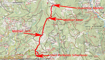 | Ausgangspunkt | Parkplatz Schermoos (1450 m) |