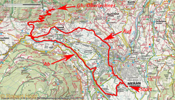 Es ist schon nach halb zwölf, als wir endlich los kommen. Durch die Stadt nach Gratsch und von da nach Unterplars. Bei der Talstation des Vellauer Sesselliftes erreichen wir die alte Landstraße. Wir kurbeln bis zur Abzweigung nach Oberplars und weiter bis zum Dorf. Der Schweiß fließt trotz der niedrigen Temperaturen reichlich. Durch das Dorf und weiter. Jetzt legt sich die Straße etwas zurück, wird aber nie eben. Vier Kehren, dann länger geradeaus. Unter dem Sessellieft durch und dann erreichen wir die letzten 3 Kehren. Bei der ersten verlassen wir den Wald und können erstmals unser Ziel sehen. Beim Ladurner wollen wir es eigentlich genug sein lassen, aber er ist geschlossen. Also weiter. Die letzten Höhenmeter und wir erreichen den Gasthof Oberlechner. Der Blick über den Meraner Talkessel, das Etschtal und den Vinschgau ist atemberaubend. Aber wir sind verschwitzt und suchen schnell das Innere des Gasthofes auf. Wir bekommen einen Platz und bestellen das Menue; aber zuerst ein alkoholfreies Hefe als Durstlöscher. Abwechselnd suchen wir das WC auf um uns umzuziehen. Mit trockenen Klamotten ist es schon viel angenehmer. Das Essen ist erstklassig; der Oberlechner ist bekannt für sein Gourmetessen. Nach dem Essen und Kaffee ziehen wir uns warm an; die Sonne ist beim Untergehen und weiter unten ist sie schon weg. Es geht recht schnell abwärts und es ist kalt. Nachdem wir die alte Landstraße erreicht haben, biegen wir auf den Radweg ab und sausen darauf weiter. In der Stadt ist es unwesentlich wärmer. Bald sind wir zuhause, wo schon eine warme Dusche auf uns wartet.