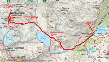Um halb sieben starten wir in Meran; wie üblich unter der Woche ist auch in Ulten relativ viel Verkehr und so brauchen wir einige Zeit bis wir den Parkplatz beim Weissbrunner Stausee erreichen. Gleich nach uns kommen eine Reihe von Autos, aber praktisch niemand geht in unsere Richtung. Wir gehen um zwanzig vor acht los. Bis zur Höchster Hütte brauchen wir 1 Stunde und 40 Minuten. Kurz vor der Stauseemauer grasen eine Herde von Haflingern im Talboden. Das Wetter ist schön, aber kalt und es weht ein fast eisiger Wind. Bei der Hütte kommen die Softshells aus den Rucksäcken und ich lege sogar ein paar Fleecehandschuhe an. Dann geht es fast eben entlang des Stausees nordwestlich Richtung Talschluss meist durch ein Blockfeld, aber der Weg ist mit ausgelegten Steinplatten einfacher gemacht. Knapp eine halbe Stunde später erreichen wir die Wegzweigung, an der wir die Richtung zur Hinteren Eggenspitze wählen. Laut Wegweiser ist es von hier aus 10 Minuten kürzer auf die Hintere Eggenspitze (2 Stunden 30 Minuten) als auf die Zufrittspitze (2 Stunden 40 Minuten) obwohl es eindeutig näher zur Zufrittspitze ist; außerdem ist es schon der 3. Wegweiser mit dieser Zeitangabe zur Zufrittspitze (einer davon bei der Höchster Hütte). Eine Viertelstunde später, auf ca. 2780 m, lassen wir den markierten Steig hinter uns und gehen weglos Richtung Weissbrunner Joch. Zwischendurch finden wir kleine Steinmännchen (meist höchstens 3 Steine übereinander geschichtet) oder aufgerichtete spitze Steine und ein paar Steigspuren; die Steinmännchen sind eher im Abstieg sichtbar und die Steigspuren verliert man leicht. In Senke unter dem Weissbrunnerjoch auf ca. 3000 m geht es direkt nach Norden. Ich folge dem vermeintlich leichtesten Weg und drifte bis unter die Felswand, die vom Kamm herunterkommt. Aber anstatt einfacher wird es schwieriger; harter Sand und lockeres Geröll mit steilem, steinigem Gelände unter mir. Ich schaffe es wieder nach rechts zu queren und jetzt wird es etwas leichter; ich finde auch wieder ein paar Steinmännchen, nur um sie bald wieder zu verlieren. Auf ca. 3100 m bleibt Bernd zurück; ihm reicht es für heute. Ich gehe weiter und habe zwei-, dreimal den Gedanken aufzugeben. Aber es geht dann immer wieder doch weiter und nach 4 Stunden und 20 Minuten bin ich am Gipfel, der von einem größeren Steinmann und einer Wetterstation geziert wird. Ich halte mich nicht länger auf; ein paar Fotos in alle Richtungen und dann wieder hinunter. Wie fast immer geht es abwärts leichter; ich finde jetzt regelmäßig Steinmännchen und Steigspuren, die mich unter der Gipfelfelswand nach Osten bis auf den Kamm leiten und von dort schräg nach Südwesten zum Punkt, wo Bernd rastet und auf mich wartet. Erst jetzt raste ich auch und wir essen unseren Proviant und reden ein bißchen über die Steinwüste rund um uns. Nach kurzer Rast steigen wir gemeinsam ab. Wie bereits erwähnt finden wir abwärts den Weg (Steinmännchen und Steigspuren) viel leichter. Wir lassen uns Zeit, kommen an der Höchster Hütte vorbei und steigen Richtung Weissbrunner Stausee ab. Nach insgesamt 7 Stunden und 35 Minuten sind wir wieder beim Auto. Auf der Heimfahrt kehren wir bei den