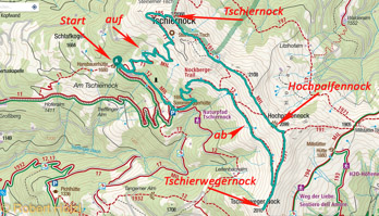 | Ausgangspunkt | Hansbauerhütte (1680 m), am Endpunkt der Tschiernock-Panoramastraße (Maut!) |