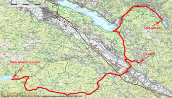 Die dritte Tour führt nach Feld am See. Es geht wieder über den Glanz; wir kennen den Weg schon auswendig, jede Steigung, jede Kurve. Wir sind in schon mit Auto, Rennrad, MTB und Trekkingbike gefahren. Die lange Gerade am Scheitelpunkt kündigt Dorf und Abfahrt an. Rasch sind wir in Döbriach am Millstätter See. Das Dorf bleibt anfangs links liegen, bevor wir dann doch ins Zentrum abbiegen, um dann die Bundesstrasse 98 und den parallel verlaufenden Radweg erreichen. Der Radweg verläuft orographisch rechts der Strasse und gewinnt manchmal auch etwas Abstand von dieser wie z.B. bei der Erdmannsiedlung. Um die entsprechenden Höhenmeter zu vermeiden, bleiben wir in diesem Fall auf der Strasse. Auf der orographisch linken Seite wird derzeit ein neuer Radweg gebaut, der aber noch nicht fertiggestellt und ausgeschildert ist. Wir gewinnen langsam Höhe, erreichen Radenthein, die Granatstadt. Die Strasse mit Radweg führt am südlichen Stadtrand vorbei, dann nordöstlich der Ostsiedlung, durch Untertweng, um schließlich Feld am See zu erreichen. Der See heißt übrigens Feldsee oder auch Brennsee und ist südlich der Ortschaft gelegen. Wir verlassen den Radweg, der der Bundesstrasse folgt, und radeln ins Ortszentrum. Zuerst zur evangelischen Kirche, wo Elisabeth das Grab des kürzlich verstorbenen Vaters einer Freundin besucht, dann trinken wir etwas im Landhotel Lindenhof und kaufen im angeschlossen Geschäft (Greisslerei) zwei kleine Mitbringsel ein. Einen Moment denken wir darüber nach über Afritz, Treffen und das Drautal zurückzufahren, aber dann entschließen wir uns doch über den Herfahrtsweg heimzufahren. Übrigens habe ich nirgends ein Hinweiszeichen auf den Weg des Buches gefunden. Bis Döbriach geht es angenehm leicht abwärts. In Döbrich kehren wir in Charly's Seelounge ein und essen einen Schüttelsalat aus dem Glas. Empfehlenswert, unser Standardgericht, wenn wir hier einkehren. Die anschließenden 200 Hm bis zum Glanz schaffen wir trotz des vollen Magens ohne größere Probleme. Bald sind wieder zu Hause.