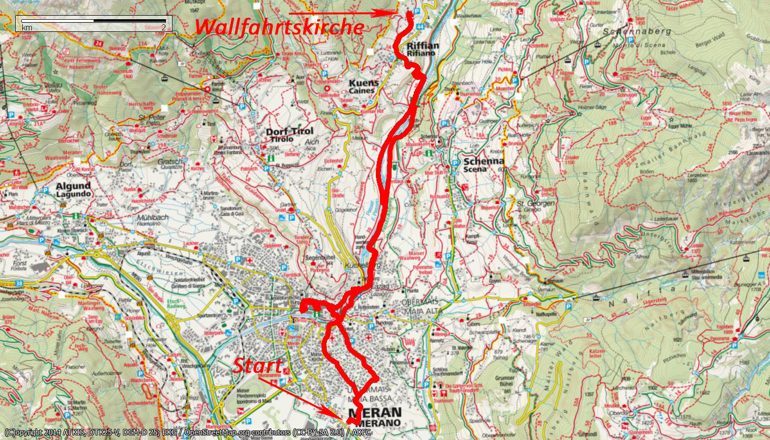 | Persönliche Bewertung | * ca. 17 km, durch Unter- und Obermais, Radweg bis nach Sportplatz Riffian, dann steil aufwärts bis ins Dorfzentrum und weiter zur Wallfahrtskirche; retour gleich mit Abstecher in Stadt. |