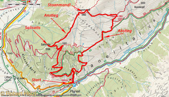 | Aufstieg | ca. 935 Hm, 2 Stunden 35 Minuten (inkl. Zwischenabstieg vom Salisatis) |