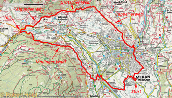 | Persönliche Bewertung | ** ca. 20,7 km, durch Unter- und Obermais, über Passer beim Steinernen Steg, dann hinauf zum Tappeinerweg, weiter bis zur St.-Peter-Strasse, ab da auf den verschiedenen Waalwegen (Gratscher, Algunder, Marlinger) bis Marling und dann hinunter und nach Hause. Alles in allem recht lang, aber doch schön. |
