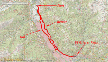 | Persönliche Bewertung | ** ca. 50 km, auf dem Radweg nach Terlan, dann auf der Strasse nach Bozen zum Grieser Platz und dem traditionellen Austernessen. Viele, viele Leute. Austern gegessen, ein paar Brötchen und ein Glas Sekt getrunken. Nichts Umwerfendes, aber ein guter Jahresabschluss. |