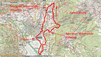Wir starten also um viertel nach elf und gehen auf dem Radweg bis nach Sinich. Dort verlassen wir den Radweg und gehen zum Restaurant Pizzeria all'Orsetto, um dort. zu essen. Wir entscheiden uns nicht für das Degustationsmenu vegetarisch für 2 Personen, sondern essen à la Carte. Nach dem Essen gehen wir auf der Hauptstrasse bis Sinich. Weiter durch Sinich und unterm Berg bis zur Katzensteinstrasse. Diese hinunter bis zum Kreisverkehr, über die Strasse und am Schießstand vorbei. Schießstandstrasse, Seilbahngasse und dann rechts zur Umfahrungsstrasse. Nachdem die Strasse überquert ist, folgen wir dem Steig, der oberhalb des St.-Valentin-Kirchleins zur Laberser Strasse führt. Bald links ab. Wir finden Wegweiser, verlieren die Waalrunde kurz unterhalb des Kienzlhofes. Anstatt zurückzugehen, folgen wir der Zufahrtsstrasse bis zur Einmündung in die Halfingerstrasse und gehen diese dann hinunter bis zur Brücke über den Naifbach. In der Kurve finden wir dann wieder auf die Waalrunde zurück. Es geht jetzt wieder etwas aufwärts, zuerst auf einer Zufahrtsstrasse und dann kommen wir erstmals effektiv zu einem Waalweg, nämlich dem Schennaer Neuwaal. Aber vorher sehen wir etwas oberhalb der Route einen Turm, der zu einer Kapelle gehören könnte. Neugierig geworden gehen wir die paar Meter aufwärts und entdecken ein schlossähnliches Gebäude, leider hinter einem abgeschirmten Zaun. Scheint unbewohnt, aber ansonsten ein wirklich schönes Haus. Aus der Karte erfahren wir, dass es sich um (Schloß?) Vernaun handelt. Eine Internetsuche bringt leider nichts zu Tage; kleines Mysterium. .-). Jetzt wird der Weg seinem Namen gerecht; im Gegensatz zu den Stücken von Burgstall bis hierher. Auch wird der Weg hier mehr begangen; in der touristischen Saison dürfte er dann ziemlich überlaufen sein, wie alle anderen Waalwege auch. Immer wieder gibt es schöne Ausblicke über den Meraner Talkessel und die Berge der Texelgruppe. Mal verläuft der Weg der Weg im (Laub)wald, mal durch Rebanlagen. Unter uns sehen wir die St.-Georg-Kirche mit Uhlenturm und Wohnhäusern. Kurz vor der Talstation der Seilbahn Taser windet sich der Weg in ein kleines Seitental, überquert einen teilweise gefrorenen Bach und steigt dann steil an, bevor es wieder ebener weitergeht. Bei der Talstation angekommen, hoffen wir auf ein offenes Lokal, aber Pustekuchen. Hier führt die Waalrunde dann talwärts. Wir folgen der Runde noch ein Stück, gehen dann aber zurück nach Schenna. Durch Schenna und dann hinunter zum Sticklen Weg und auf dem Maiser Waalweg bis zum Schloss Planta. Durch Obermais vorbei an Schloss Rubein geht es dann die Mayr-Nusser-Strasse hinunter und über Hagengasse, Rempgasse und St.-Florian-Gasse nach Hause.
