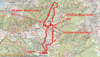 Wir starten um 20 nach elf und gehen nach Obermais bis zur Haltestelle in der Schennastrasse vor der Kreuzung mit der Ifingerstrasse. Da wir aber warten müssten, gehen wir weiter bis zur Haltestelle in der Kurve unter Schloss Goyen. Der Bus kommt bald und wir fahren bis zur Haltestelle nach Schenna an der Kreuzung mit der Ifingerstrasse (nicht zu verwechseln mit jener in Meran. Ausgestiegen sehen wir auch gleich auf der anderen Strassenseite den Wegweiser, der uns Richtung Schloss Thurn/Thurnerhof weist. Am Hof vorbei erreichen wir den Steig, der anfangs mit dem Sagenweg übereinstimmt. Wir nehmen uns die Zeit und lesen bei den verschiedenen Stationen, die mit Holzskulpturen und Textmarkern gekennzeichnet sind, die Sagen. Nach drei Stationen geht die Waalrunde in eine andere Richtung. Abwärts queren wir die Strasse, die von Schenna herunterführt, und erreichen dann den Maiser Waalweg. Auf diesem geht es Richtung taleinwärts; zwischendurch hat der Heimatverein Obermais Texttafeln aufgestellt, die auf Ortsnamen und andere interessante Punkte hinweisen, unter anderem auf die Reste des alten Waalerhauses. Schlussendlich erreichen wir den Torgglerhof, oder wie er jetzt heisst, das Apfelhotel. Ein ausufernder Komplex wie er hier in Passeier anscheinend üblich ist. Jeder muss mit dem Quellenhof mithalten. :-( Wir überqueren die Passer und kehren gleich danach bei der Bar Radlstadl ein. Wir essen je einen Toast (Bauerntost für mich und normaler Schinken-Käse-Toast für Elisabeht) und drinken etwas. Das einzige Lokal, das bis St. Martin offen hat. Dann geht es aufwärts an der Talstation der Seilbahn Hirzer vorbei über die Strasse und weiter den Berg hinauf. Auf dem Rösslsteig geht es jetzt talaus. Wenn wir den Maiser Waalweg zumindest teilweise kannten, ist dieser Teil der Waalrunde wieder komplett unbekannt, aber auch wirklich schön. Bei Riffian geht der Rösslsteig dann in den Riffianer Waalweg über (wenn auch der namengebende Waal nicht mehr existiert oder vielleich auch verrohrt ist). Hier treffen wir wieder Menschen, so wie auf dem Maiser Waalweg. Oberhalb von Kuens erreichen wir die Kuenser Strasse und entscheiden, dass es für heute reicht. Jetzt ginge die Waalrunde nämlich ca. 300 Hm bergauf bis zum Oberen Kuenserwaal. Wir gehen auf der Strasse bergab bis zur Passeierer Strasse und wollen eigentlich den Bus nach Meran nehmen. Irgendein Teufelchen reitet uns und wir entscheiden uns bis zum Radweg an der Passer abzusteigen und zu Fuß nach Hause zu gehen. Der Weg zieht sich und wir verfluchen unsere Entscheidung. Nach über 23 km und 4,5 Stunden sind wir zu Hause. Die Beine schmerzen.
