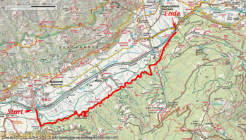Der nächste Teil der Meraner Waalrunde wird heute unter die Sohlen genommen. Wir fahren mit dem Auto bis zum Bahnhof Töll, parken dort und nehmen den Zug nach Naturns. Vom Bahnhof Naturns geht es auf Teerstrasse genau nach Süden zum Nörderberg; bald geht dann in Gehrichtung links der Rittersteig (Nr. 1) ab. Die heutige Trasse gehört zwar zur Meraner Waalrunde, es gibt aber in diesem Bereich keinen Waal, nicht einmal einen verrohrten Waal, so wie auch auf dem Stück von Niederlana nach Burgstall und bis in die Naif. Da wir uns unterm Nörderberg bewegen, sind wir hier im Schatten obwohl es schon fast Mittag ist. In einem Gehege, das talseitig an den Weg angrenzt, halten sich drei Esel auf. Carlo ist von den Tieren fasziniert und auch diese kommen bis zum Zaun, um Carlo genauer zu betrachten. Bald danach sind wir schon wieder auf Teerstrasse. Wir umrunden Schloss Dornsberg, dessen Wehrturm bereits etwas Sonne abbekommt. Wir verlassen wieder die Teerstrasse und interpretieren bald danach einen Wegweiser falsch, wodurch wir ein paar Höhenmeter umsonst machen, bevor ich den Fehler bemerke. Carlo ist das vollkommen gleich. Zurück und auf der richtigen Trasse weiter. Wir kommen an einem verlassenen Gebäude (Bauernhof?) vorbei; das Gebäude trägt sogar noch eine Hausnummer. Bald erreichen wir die erste Station des "Alpine Wellfit Parcous", der sich mit dem Herrensteig überlappt. Weiss nicht, warum alles in Englisch benannt werden muss; die Tourismusorganisationen halten das wahrscheinlich für fortschrittlich. Naja. Es handelt sich jedenfalls laut einem Informationsschild um den einzigen zertifizierten "Alpine Wellness Ort" (in Italienisch "località Alpine Wellness :-)) Südtirols und wurde mit Leader-Gelder teilfinanziert. Wer den Ort zertifiziert hat, wird nicht verraten. Oberhalb von Plaus kommen wir an einer Materialseilbahn vorbei mit einem Milchkessel, der darauf wartet entweder geleert oder zurück "gedrahtelt" zu werden. Der Steig bleibt ziemlich genau an der Waldgrenze; manchal ein bisschen im Wald, manchmal darunter (auch zwischendurch auf Strasse). Alles in allem immer wieder leicht bergauf und bergab. Hier lasse ich Carlo frei laufen. Wir kommen im Wald an einer verfallenen Hütte vorbei, bei der nur mehr ein paar Mauerreste stehen. Alles ist moosüberwachsen und die Sonne dürfte kaum mit ihre Strahlen an diesen abgelegenen und schattigen Ort vordringen. Als der Steig den Wald wieder verlässt, wandelt er sich in eine süditalienische Promendade um; zumindest kommt es mir so vor. Zypressen, Olivenbäume und Trockenmauern säumen die nun breite "Promenade"; zwischendurch sind am Wegesrand verrostete alte Bauerngeräte "ausgestellt". Die Promendade gehört zum Biohof Niedereben. Gleich hinter dem Hof ist ein noch in Betrieb befindliches Wasserrad zu sehen. Nun nähern wir uns so langsam dem Ende unserer Wanderung. Der Wald ist nun hauptsächlich Laubwald, der Steig gut gepflegt. Auf der gegenüberliegenden Talseite ist der Sonnenberg mit dem Teilstück der Meraner Waalrunde, das wir vor einer Woche begangen haben. Unser Weg fällt nun leicht ab und schlussendlich erreichen wir Onkel Taa's Restaurant und k.u.k. Museum Bad Egart. Rechts und links des Weges sind die Gebäude mit allerlei "Krempel" behangen; das Restaurant ist um diese Jahreszeit geschlossen. Zum Ensemble gehört auch eine rosarot und hellgrün gestrichene Kapelle, die mit einer Unmenge von Heiligenstatuen verziert ist. Danach sind es noch ein paar Schritte auf der Teerstrasse und wir erreichen den Parkplatz des Bahnhofes, wo das Auto steht: