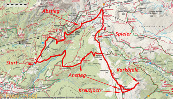 | Aufstieg | ca. 770 Hm, 3 Stunden, 30 Minuten, davon 2 Stunden 25 Minuten bis aufs Karköpfele und 1 Stunde 5 Minuten weiter bis auf Spieler |