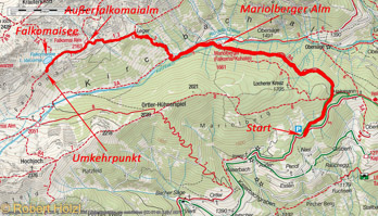 | Persönliche Bewertung | *** ca. 11,5 km; das Kirchbachtal weist 3 Almen auf, die alle bewirtschaftet sind (Innere und Äußere Falkomaialm, mariolberger Alm. Ein schönes Wandergebiet mit eventuellen Gipfelzielen. Das Wegstück zwischen Falkomaisee und Innerer Falkomaialm ist etwas ausgesetzt und seilgesichert. |