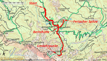 | Aufstieg | 1070 Hm, 2 Stunden 10 Minuten (bis Umkehrpunkt Mittagskogel auf 1820 m, 740 Hm), 1 Stunde 30 Minuten bis zur Ferlacher Spitze, insgesamt 3 Stunden 40 Minuten |