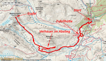 Wir starten um halb zehn vom Parkplatz im Talschluss. Der Parkplatz ist schon recht gut gefüllt und auf dem Weg zur Zufallhütte sind einiges an Leuten unterwegs. An der Hütte vorbei geht es in Aufschwüngen zur Schwemmebene der Plima mit dem alten Staudamm aus dem 19ten Jahrhundert, der derzeit instand gesetzt wird. Jetzt sind schon deutlich weniger Leute unterwegs. Der schöne Steig bringt uns leicht ansteigend bis fast ans Ende des abzweigenden Butzentales, bevor wir zur Abzweigung mit Wegweisern ins Butzental kommen. Hier scheinen wir die einzigen zu sein, die Richtung Madritschspitze gehen. Welch Fehleinschätzung. Bald folgt eine Abzweigung zur Mutspitze. Wir gehen weiter. Das Tal steigt in Aufschwüngen und Flachstücken (naja, nicht gerade flach, aber nicht so steil) an. Es kommen uns jetzt immer wieder Leute im Abstieg entgegen. Ich zähle; bis zum Gipfelanstieg steigen 25 Personen ab. Kurz unter dem Gipfel überholen wir die einzigen, die vor uns aufsteigen (4 Personen) und dann kommt der Gipfel mit Kreuz ins Blickfeld. Welch Schock; ich zähle schnelle durch. Mehr als 30 (!) Personen haben sich um den Gipfel herum niedergelassen. Als ich das erste Mal vor über 3 Jahrzehnten alleine auf Berg gestiegen bin, gab es noch keinen Steig und keine Markierung und auch keine Leute, weder im Aufstieg noch im Abstieg noch am Gipfel. Wir machen schnell ein Gipfelfoto und lassen uns dann ein Stück unterhalb des Gipfels nieder, um unsere Brote zu essen. Carlo bettelt so lange, bis er die Hälfte von Elis Broten bekommt und ein paar Stücke von meinen. Dann machen wir uns auch schon wieder an den Abstieg. Auch da begegnen wir noch 6-7 Leuten. Wir kommen an der Abzweigung zur Mutspitze vorbei und achten nicht mehr so auf den Steig und folgen einer Steigspur, die höher am Hang aus dem Tal hinaus quert. Als uns bewusst wird, dass wir den Anstiegsweg verlassen haben, hoffen wir, dass auch dieser Weg uns talwärts führen wird. Vor ein paar Platten verschwindet der Steig; da der Weiterweg unsicher scheint, gehen wir zurück. Wir treffen ganze Mengen von Leuten, die sich ebenfalls in die Irre führen haben lassen. Während wir schräg taleinwärts wandern und dabei Höhe verlieren, bis wir den richtigen Steig gefunden haben, haben die übrigen Leute anscheinend doch noch einen Abstieg gefunden. Wir treffen sie später wieder auf dem Steig und sie erzählen uns, dass sie Steigspuren gefunden haben und auf diesen abgestiegen sind. Wir wandern talauswärts und kehren auf der Zufallhütte ein, um zu essen (Käseknödel mit Krautsalat ich, Gulasch mit Knödel und Blaukraut für Eli; Hirschgulasch war aus). Dann bringen wir die letzte halbe Stunde hinter uns; meine Knie schmerzen. Es ist doch lange und einiges an Höhenmetern: Nach 6 Stunden und 20 Minuten reiner Gehzeit sind wir wieder beim Auto.