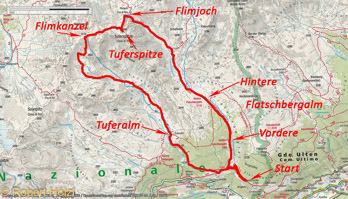 | Persönliche Bewertung | *** ca. 14,6 km. Lang , Aufschwünge mit nachfolgenden flacheren Stücken, letzter Anstieg zum Joch steil und steinig, ab Joch auf Tufer Steigspuren, aber markiert, auf Flimkanzel wenige Steinmänner, auf Sicht, kaum begangen, Abstieg weglos durch das Tufertal. |