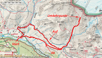 | Aufstieg | ca. 975 Hm, 3 Stunden (bis Umkehrpunkt auf ca. 2880 m) |