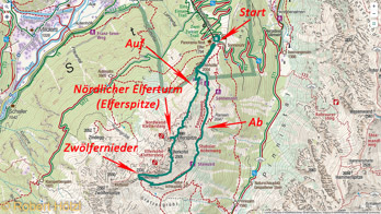 | Stützpunkt | Elferhütte (2080 m, vor Ort mit diesem Wert angegeben, in den Karten mit 2004 m kotiert) |