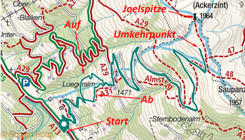 Bißchen spät von Innsbruck gestartet und die Strecke bis zum Startpunkt unterschätzt, daher starte ich erst um 11 Uhr vom Parkplatz. Ist übrigens frei, freiwillige Spende zugunsten Pfarre erbeten. Anfangs geht es über eine Höfezufahrt bis zum Hofgatter, dann leitet eine Markierung entlang des Wiesengatters bis zum Waldrand. Die Markierung bzw. die entsprechende Spur ist mir nur aufgefallen, da am Hofgatter ein Schild mit "Privat - Eintritt verboten" angebracht ist. Durch den Wald wird bis zur Lichtung unterhalb der Luegeralm aufgestiegen. Gleich nach dem Gatter, durch das man die Lichtung betritt (Lichtung ist eigentlich das falsche Wort, ab hier ist offenes Gelände), verliere ich die Markierung und gehe nach links den Waldrand entlang statt nach rechts aufwärts. Am linken Waldrand steige ich eher steil weglos bergan; die Schneedecke ist hier noch nicht geschlossen, aber es liegt schon einiges an Schnee. Ich kontrolliere dann anhang meiner App meine Position und bewege mich dann aufwärts gehend Richtung markierten Steig, den ich kurz unterhalb der Luegeralm erreicht. Zwischen den Gebäuden hindurch zur Wirtschaftsstrasse und auf dieser ein Stück weiter. Bald zweigt rechts der Steig ab, der eine Strassenkurve abschneidet und den ich nehme. Ab hier ist die Schneedecke geschlossen, wenn auch die Schneedecke noch nicht tief ist. Bald erreiche ich wieder die Strasse, die zur nächsten Alm führt. Der Schnee wird tiefer; ist doch mehr gefallen, als ich dachte. Ich erreiche die (Obere) Sternbodenalm; laut Karte sollte hier der Wirtschaftsweg enden, aber er geht weiter oder zumindest ein sehr breiter Steig, der eher einer Strasse gleicht. Auf der Hangseite fließt ein kleines Rinnsal und hat den Schnee geschmolzen. Ich ziehe es vor im Wasser zu gehen als im Schnee zu stapfen. Der Hang oberhalb des Steiges/Strasse ist zwar etwas steiler, aber es liegt noch nicht soviel Schnee als dass ich mir Sorgen wegen einer Lawinengefahr machen müsste. Trotz des Trickes mit dem Gehen im Wasser wird es immer anstrengender und ich komme deutlich langsamer voran als geplant. Ich erreiche dann das namenlose Joch zwischen Saupanzen und Joelspitze. Die Variante Saupanzen ist mir zu steil, so gehe ich Richtung Joelspitze, auch da hier etwas weniger Schnee liegt. Wahrscheinlich hat hier der Wind etwas mitgeholfen. Von dem Vorgipfel aus sehe ich endlich die Joelspitze; noch ein Flachstück und dann ca. 40 Hm. Aber sowohl das Flachstück als auch der letzte Anstieg sehen auch, als ob der Schnee relativ tief sein würde. Ich entscheide mich auf den Gipfel selbst zu verzichten und kehre um. Abwärts geht es einfacher und viel schneller. Unterhalb der Luegeralm finde und bleibe ich diesmal auf dem richtigen Weg. Nach insgesamt 3 Stunden und 50 Minuten sind Carlo und ich wieder beim Auto. Carlo bekommt jetzt zu fressen und auch ich esse einen Riegel. Als ich für Carlo Wasser von dem kleinen Bach jenseits der Strasse hole, merke ich dass die Strasse hier überfroren und a___glatt ist. Eine schnelle Kontrolle am unteren Ende des Parkplatzes zeigt, dass dort die Strasse sicher ist. Dies nütze ich dann bei der Losfahrt.