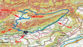 | Persönliche Bewertung | ** ca. 21 km; Wetter vormittags eher schlecht, einzelne Regentropfen, am Joch windig, nachmittags sonnig und warm, viele Leute, auch mit MTB. |