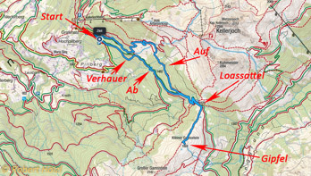 | Ausgangspunkt | Parkplatz Loas bei Talstation Kellerjochlift (1380 m); gebührenpflichtig Euro 4,00/Tag |
