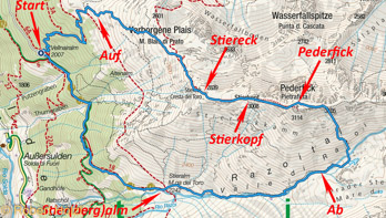 Von der Alm starten wir um ca. viertel nach neun. Wir nehmen den Steig 3A Richtung Gaflaunboden und bei der nicht nummerierten, aber markierten Abzweigung, die rechtsabgehend direkter zum Gaflaunboden führt, nehmen wir diese. Wir kommen an der Durnwalderhütte vorbei; heute ist niemand hier. Gleich nach der Hütte kommen wir zum Steig, der entlang der Südwesthänge zur Stier(berg)alm führt. Auf diesem Weg weiter und 2 Kurven später sind wir oberhalb der Waldgrenze auf dem Gaflaunboden. Hier zweigen wir weglos ab. Jetzt müssen wir uns den Weg selbständig suchen. Ca. 100 Hm weiter oben finden wir Steigspuren und auch verblasste Markierungen. Wir versuchen diesen Steigspuren zu folgen; zwischendurch verlieren wir sie, nur um sie bald darauf wieder zu finden. Je weiter wir nach oben kommen, desto besser werden die Steigspuren; sie können jetzt schon fast als Steig bezeichnet werden. Wir erreichen wir den Kamm und treffen auf den Steig 3, der von der Verborgenen Blais herzieht. Er ist schon seit einiger Zeit sichtbar, da der Südhang der Verborgenen Blais schön eingesehen werden kann. Wir folgen den Markierungen, kommen zuerst am Stiereck vorbei, bevor wir uns dem Stierkopf nähern. Ab hier wird das Gelände felsiger und wir müssen verstärkt auf die Markierungen achten, da der Steig im felsigen Gelände nicht mehr so offensichtlich ist. Den Stierkopf besteigen wir nicht, sondern gehen unter ihm durch. Dann folgt der letzte kurze Aufschwung und urplötzlich kommt das neue Gipfelkreuz des Pederfick ins Blickfeld. Noch ein paar Schritte hinab in eine Mulde und dann links des Gipfels in eine Scharte zwischen Hauptgipfel und einem links aufragenden Vorgipfel mit Steinmann in Form eines Inukshuks. Inukshuks sind "Männchen" aus Stein, die von den Inuit (=Eskimos) in der kanadischen Subarktis (z.b. Baffin Island) als Wegmarkierungen verwendet werden und kreuzförmig einen Menschen nachbilden. Hinter der Scharte nochmals zwei, drei Schritte abwärts, wir umrunden den Gipfelblock, und erreichen schließlich unschwierig das Gipfelkreuz des Pederfick . Die letzten paar Meter zum Kreuz legen wir Hände an den Fels. Das Kreuz steht auf einem Felszacken und südlich davon verläuft ein Kamm, der fast die gleiche Höhe aufweist. In den Karten ist der Gipfel auf diesem Kamm angesiedelt. Die Aussicht in den Vinschgau ist phänomenal, ebenso nach Westen und Süden. Einzig Richtung Osten wird die Aussicht durch die nahe und über 200 m höhere Tschenglser Hochwand etwas eingeschränkt. Nach den üblichen Gipfelfotos und der Marende überlegen wir, wie wir weitergehen sollen. Ursprünglich hatten wir so eine halbe Idee, die Tschenglser Hochwand zu überschreiten, aber darauf verzichten wir. Wir entließen uns, dem Kamm Richtung Tschenglser Hochewand ein Stück zu folgen, um zu sehen, wie das Gelände aussieht und dann rechts ins Razoital abzusteigen. Wir gehen also den Kamm Richtung Tschenglser Hochwand weiter und umgehen den ersten Aufschwung auf der rechten Seite. Beim zweiten Aufschwung , den man auch links umgehen könnte, biegen wir nach rechts in den Hang ein und suchen uns einen Weg in den Talboden. Wir orientieren uns dabei an einem kleinen See, der offensichtlich von Schmelzwasser gespeist wird und später im Sommer wahrscheinlich austrocknet. Vom See aus gehen wir talauswärts und finden bald einen alten Steig, der uns bis kurz vor die Stier(berg)alm führt. Der Steig ist in alten Karten und in verschiedenen Apps eingezeichnet und da er in eher flachem Gelände und unterhalb der Gesteinsgrenze verläuft, ist er erhalten geblieben. Kurz vor der Alm verliert sich der Steig; über die Weide erreichen wir die Stier(berg)alm . Da wir bereits am Gipfel gerastet haben, halten wir uns hier nicht lange auf und gehen auf dem Steig 18 bis zur Einmündung des Steiges 6 und auf diesem zur Vellnairalm. Der Weg von der Stier(berg)alm zur Vellnairalm verläuft in leichtem Auf und Ab und nur bei der Querung des Thurngrabens haben wir ein bißchen Gegenanstieg zu bewältigen. Nach 6 Stunden 40 Minuten sind wir wieder beim Auto. Auf der Heimfahrt kehren wir wieder ein für unseren üblichen Tourenabschluss.