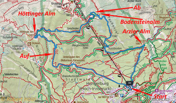 | Stützpunkt | Umbrüggler Alm (1123 m) , Höttinger Alm (1487 m), Bodensteinalm (1661 m), Arzler Alm (1067) |