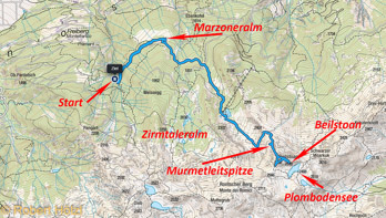 Aufgrund dieser Umdisponierung starten wir schon um 8:30 h vom Parkplatz bei der Freiberger Säge, der noch praktisch leer ist. Nach einer halben Stunde sind wir bei der Marzoner Alm, kehren aber nicht ein. Wir folgen dem Wegweiser. Der Weg ist anfangs angenehm, führt dann durch einen Bereich, der vom Sturmtief Vaia verwüstet wurde (eine Infotafel ist aufgestellt, jetzt aber schon besser ausschaut als letztes Jahr) und wird dann steiler. Die Steilheit lässt dann wieder nach, um auf dem letzten Teil vor der Zirmtaler Alm wieder steiler zu werden. Nach knapp weniger als 2 Stunden sind wir bei den Seen und der gleichnamigen Alm, die auch bewirtschaftet und bereits stark besucht ist. Auch hier halten wir uns nicht weiter auf. Wir gehen weiter Richtung Talschluß. Aus einem Stall aus Trockenmauerwerk sehen uns zwei Kühe an. Im Talschluß biegt der Steig nach links ab und zieht weiterhin in angenehmer Steigung den Hang querend auf den Rücken, der in der Karte als "Moarkuck" bezeichnet wird. Ein links vom Beilstoan liegender Gipfel wird sinnigerweise als Schwarzer Moarkuk, also ohne "ck", geschrieben. Ein Aufschwung führt den Rücken hinauf und etwas abseits und niedriger als der höchste Punkt steht ein kleines Kreuz. Der Gipfel ist in manchen Karten nicht verzeichnet; es ist der Murmetleitspitz; hier finden wir einen Wanderstein, der mit uns weiterwandert. Über den höchsten Punkt geht es weiter zum Beilstoan; auf dem Weg dorthin sehen wir auch ein schmales Felsfenster. Der Beilstoan ist auch so ein Gipfel, bei dem der höchste Punkt nicht klar ersichtlich ist. Wir wandern alle möglichen höchsten Punkte ab und fotografieren die Plombodenseen, auch "Drei Seen" genannt, die auf der Ultner Seite hoch oben im Kirchbachtal liegen. Ein kurzer Abstieg und wir finden ein windgeschütztes Plätzchen zum rasten. Alle bekommen etwas zu Essen und Trinken. Während wir rasten kommen zuerst eine und dann noch zwei Wandererinnen vorbei. Ziemlich begangen der Gipfel; unter der Woche noch drei andere Leute hier unterwegs. Überlaufen :-). Nach der Rast machen wir uns auf den Abstieg. Auch jetzt kehren wir bei der Zirmtaler Alm nicht ein, sondern gehen weiter bis zur Marzoner Alm. Hier gönnen wir uns einen Schmarrn (für mich) und einen Marillenkuchen (für Bernd), dazu noch Kaffee und alkoholfreies Bier. Carlo bekommt Wasser; er muss ja noch fahren. Dann ist es nicht mehr weit bis zum Auto.