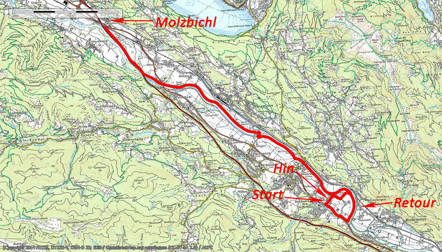 Wieder eine Woche später starten wir nochmal Richtung Spittal/Drau, aber schon bei der Flusssperre bei Paternion wechseln wir die Flußseite. Auf der orographisch linken Seite fahren wir bis zur Abzweigung nach der Brücke bei Mauthbrücken und fahren nach Beinten zur Strasse nach Ferndorf. Wir zweigen aber bald links ab nach Rudersdorf und jetzt geht es bergauf. Durch Rudersdorf durch und leicht abwärts bis zum Dorfrand von Ferndorf. Ab hier wieder aufwärts. Sonnwiesen, dann folgt St. Jakob und nach dieser Fraktion geht es in den Wald und die Steigung lässt nach. Zuletzt leicht abwärts zur Strasse über den Glanz. Hier haben wir den höchsten Punkt erreicht und jetzt lassen wir es sausen bis hinunter zur Brücke nach Feistritz. Ab hier folgen wir dem Drauradweg nach Hause.