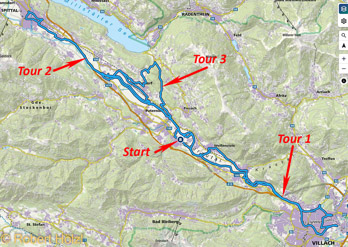 Die erste Radtour führt uns auf dem Drauradweg nach Villach und durch Villach hindurch. Am südöstlichen Stadtrand suchen wir uns dann einen Weg durch die Stadt bis zum Vassacher See, wo wir im Restaurant des CampingSeehofes einkehren und essen. Eli wählt einen Backhendlsalat und ich einen XL-Texas-Burger. Nach dem Essen fahren wir über die Bundesstrasse 100 bis zur Abzweigung vor der Brücke über die Drau und biegen dort rechts auf die Landstrasse ein. Auf dieser Nebenstrasse fahren wir durch Puch bis nach Weißenstein und kehren dort über Kellerberg auf den Drauradweg zurück. Bald danach sind wir wieder zu Hause.