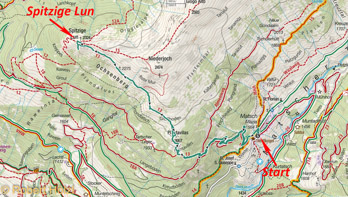Ich muss wieder einmal mein Auto beim Mechaniker in Schluderns abgeben und so entschließen wir uns, dort in der Gegend eine Tour zu machen. Ursprünglich haben wir das Großhorn im Blickfeld gehabt, aber da es vor zwei Tagen etwas geschneit hat, wählen wir schlussendlich ein südseitiges Sicherheitsziel, nämlich die Spitzige Lun (obwohl wir heuer schon zweimal oben waren).