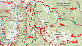 | Abstieg | ca. 550 Hm, 2 Stunden 35 Minuten (ab Monte Pòpi) |