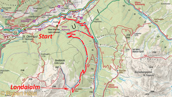 | Ausgangspunkt | Parkplatz in der ersten Kurve auf der Strasse zum Falschauerhof (1345 m) |