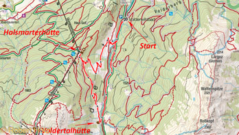 | Stützpunkt | Vordertalhütte (1376 m) geschlossen, Halsmarterhütte (1567 m) im Schigebiet |