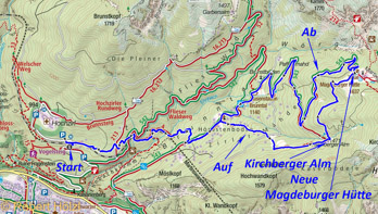 | Stützpunkt | Jausenstation Brunnalm (geschlossen, 1140 m), Neue Magdeburger Hütte (geschlossen, 1633 m) |