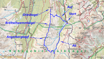 | Aufstieg | ca. 920 Hm, 2 Stunde 25 Minuten (1 Stunde 10 Minuten bis Grieskogel, 35 Minuten bis Breitschwemmkogel) |