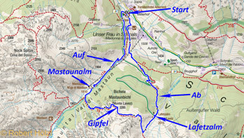 | Stützpunkt | Mastaunalm (1810 m), Lafetzalm (2015 m) |