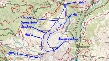 | Abstieg | ca. 990 Hm, 2 Stunden 15 Minuten (Übergang zum Sonntagsköpfl 55 Minuten) |