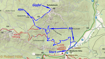 Wie üblich im Urlaub nicht allzu früh los. Mit dem Auto auf die Windische Höhe und um knapp nach halb zwei gestartet. Auf der Wiese, durch die der Steig geht, weiden Kühe, also entscheiden wir uns, den Forstweg zu nehmen, da Eli und Carlo Abgang vor den Kühen haben. Wir wandern gemütlich auf der Forststraße dahin und ignorieren 2 Mal den Gailtaler Höhenweg, der die Straße kreuzt. Erst das dritte Mal zweigen wir von der Straße auf den Steig ab. Es geht steil durch den Wald aufwärts und in der Schwüle fließt der Schweiß in Strömen. Einzig Carlo lässt das kalt. Wir schneiden öfter Forststraßen, aber bleiben jetzt auf dem Steig. Erst kurz vor der Hadersdorfer Alm bleiben wir wieder auf der Straße. Eigentlich haben wir erwartet, dass die Alm bewirtschaftet ist, aber dem ist nicht so. Nur ein Kastenwagen ist in der Nähe geparkt und es offensichtlich probegebohrt. Nach was, wissen wir nicht. Wir gehen ein kleines Stück zu weit auf der Forststraße, finden dann aber gleich den richtigen Steig 1, der zum Tschekelnock führt. Der Steig führt zuerst querend durch den Wald und biegt dann nach Nordost ab. Jetzt geht es ziemlich geradlinig Richtung Gipfel. Kurz vor dem letzten Anstieg verlässt der Steig den Wald und es geht den Gipfelhang Richtung Kreuz. Nach knapp zwei Stunden sind wir am Gipfel. Nach dem Kreuz könnte man noch den hier schmalen Kamm zur nächsten Erhöhung gehen, aber laut Karte scheint das Kreuz am höchsten Punkt zu stehen. Wir rasten und alle bekommen zu Essen und zu Trinken. Dann machen wir uns gemütlich an den Abstieg. Wir schneiden die beiden ersten Kehren nach der Alm über den Steig ab, absolvieren den restlichen Abstieg dann aber auf der Forststraße. Kurz bevor wir nach der letzten Kehre der Straße den Wald verlassen, sehen wir, dass die Kühe weitergewandert sind und jetzt zwischen uns und der Fahrstraße sind. Wir steigen weglos durch den Wald bis zur Straße ab und ich gehe dann entlang der Straße, um das Auto zu holen. Ich komme auch an drei Pferden vorbei, die links der Straße weiden. Als ich mit dem Auto wieder dort vorbeikomme, haben die Pferde schon die Seite gewechselt. Die Weiden rechts und links der Straße sind nicht eingezäunt, man riskiert also Weidetiere auf der Straße anzutreffen.