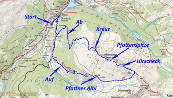 | Persönliche Bewertung | *** ca. 15 km; angenehmes Wanderwetter, über Mittag bewölkt; Abstieg weglos durch Latschenfelder, nicht empfehlenswert; niemanden getroffen, nur Arbeiter auf Pfattner Albl. |